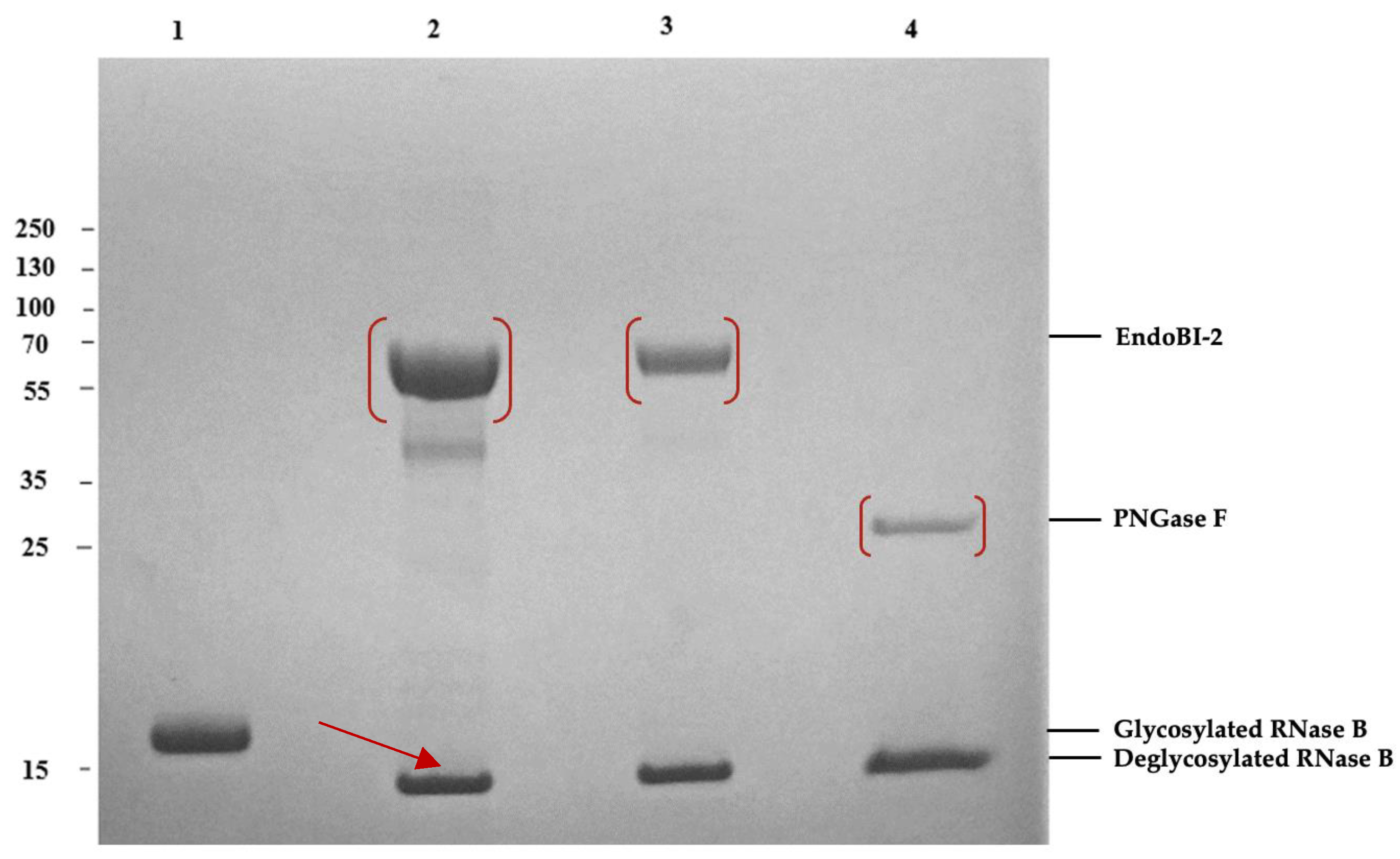 4.3. EndoBI-2 Enzymatic Activity Using Model Glycoprotein