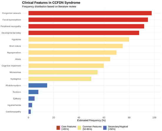 Table 1 (see below) summarizes key clinical and genetic studies describing the phenotypic spectrum and patient demographics of CCFDN syndrome across diverse Roma populations. Although not a systematic review, the table integrates 17 comprehensive studies from observational cohorts, genetic screenings, and case reports, providing a consolidated resource to appreciate the multi-systemic impact and phenotypic spectrum of CCFDN syndrome across diverse populations. In addition to patient ages, ethnic origins, and main reported features, we included a dedicated column highlighting key findings and contributions of each paper to facilitate a clear understanding of the evolving knowledge in the field. This overview underscores the importance of early molecular diagnosis and tailored multidisciplinary care for affected individuals. To facilitate comprehension of the complex phenotypic spectrum, Figure 4 provides a visual summary categorizing clinical features by estimated frequency into core features (>85% of patients), common features (50–85%), and secondary/atypical features (<50%), based on manual analysis of the reported cases across all studies. The figure was generated using R version 4.3.1 with ggplot2 and dplyr packages.