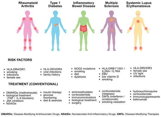 Type 1 diabetes (T1D) is a chronic AD characterized by T cell-mediated destruction of pancreatic β-cells, leading to absolute insulin deficiency [67]. Globally, approximately 8.4 million individuals are affected, and the prevalence continues to rise by 2–3% annually [68,69]. The level of the T1D-affected population is projected to reach 13.5–17.4 million by 2040 [68]. T1D is a polygenic disorder, one strongly influenced by the human leukocyte antigen (HLA) region [70,71]. Beyond the HLA region, over 60 non-HLA susceptibility loci have been identified, including CTLA4, PTPN22, IL2RA, INS, KIR and VNTR polymorphisms, which modulate immune tolerance and β-cell antigen presentation [72,73,74]. Environmental triggers interact with this genetic background to initiate β-cell autoimmunity. Enteroviral infections, particularly Coxsackievirus B, have been implicated in disease onset through mechanisms such as molecular mimicry and local β-cell inflammation [75]. Other risk factors, including gut-microbiota dysbiosis, vitamin D deficiency, early-life obesity and diet, contribute to immune dysregulation [76].