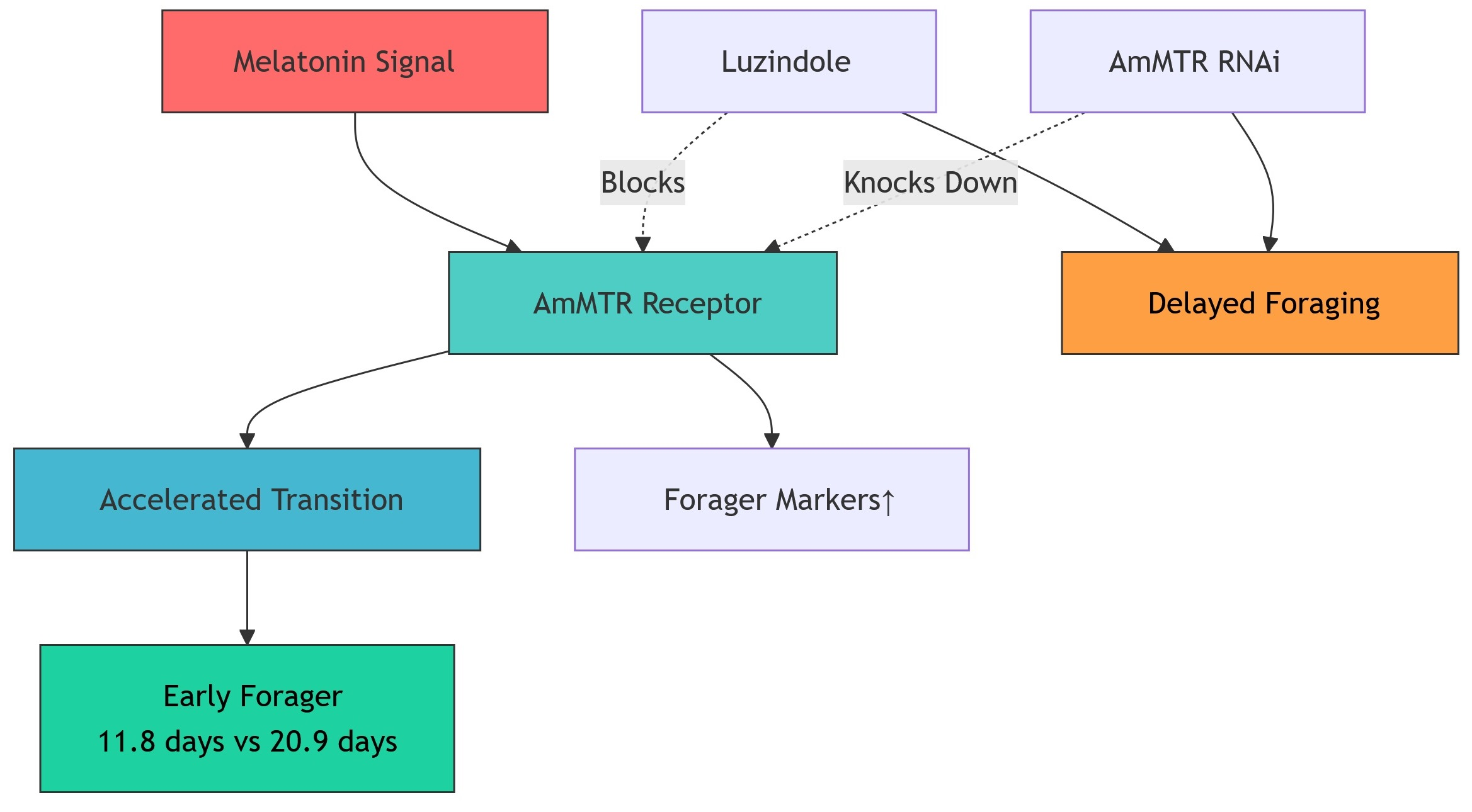Here we test whether indolamine acetylation and melatonin signaling causally contribute to age-dependent behavioral maturation in A. mellifera. Using exogenous melatonin, pharmacological antagonism (luzindole, an MT2-preferring melatonin receptor antagonist), RNAi knockdown of the putative receptor (AmMTR/AmMT2), and natural-colony behavioral assays, we evaluate whether perturbing the melatonin pathway alters (1) probability and timing of hive exit and first waggle dance (foraging onset), (2) brain expression of a forager marker (Amα-glucosidase) and dynamics of AmNAT1/AmNAT2, and (3) receptor transcript abundance/function. We pair these experiments with in silico structural modeling (class-A GPCR classification, candidate ligand pockets) and promoter scans showing circadian motif enrichment upstream of AmMTR, thereby testing causality, receptor dependence, and circadian integration of the 5-HT → AANAT → melatonin axis in behavioral maturation. Demonstrating that melatonin signaling can both advance foraging and be necessary for normal foraging propensity—while linking receptor structure and clock-regulated transcription—would integrate indolamine pathways into endocrine and social-cue frameworks for division of labor.