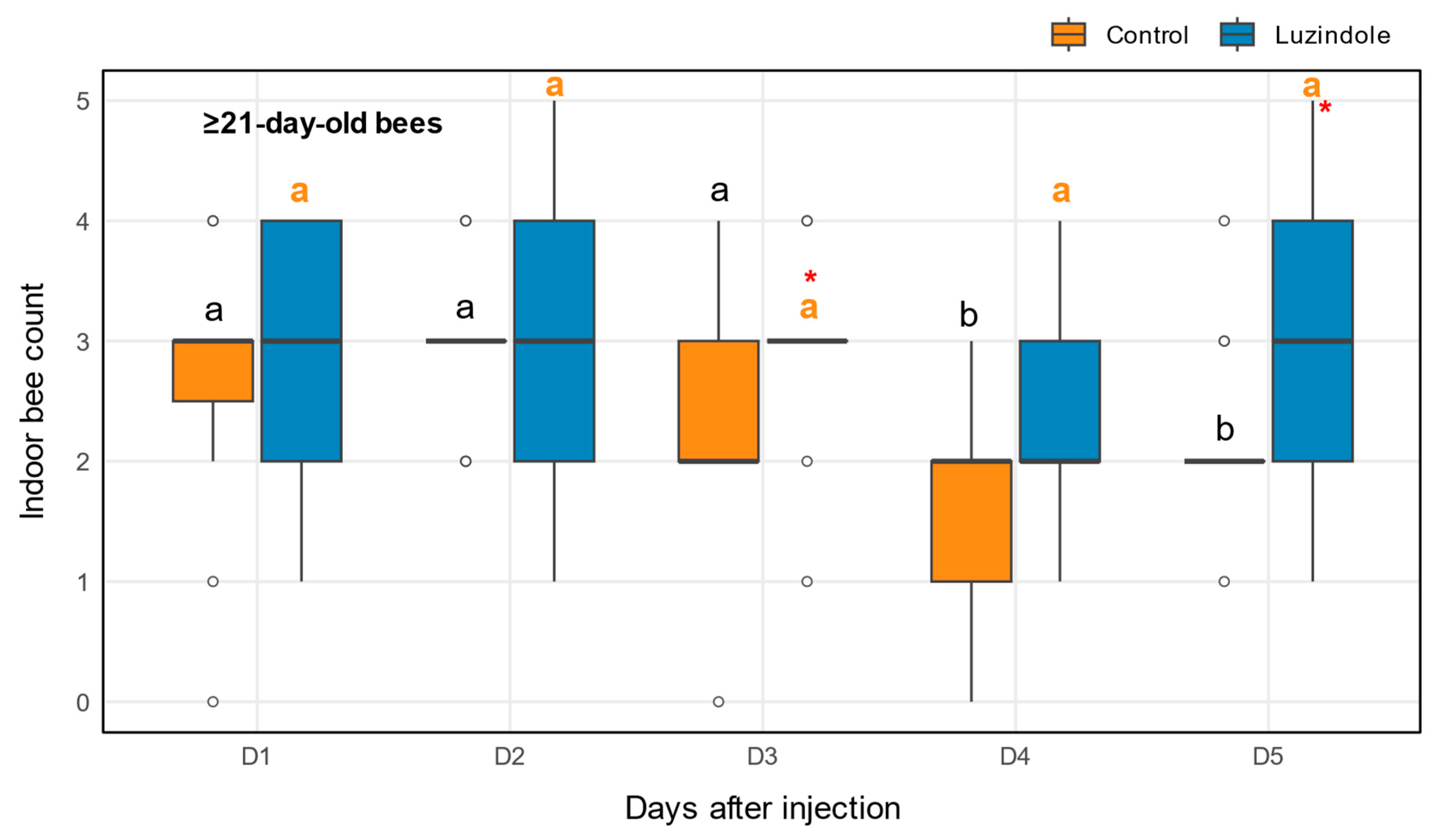 In 2-day-old bees monitored for 6 days post-injection, melatonin treatment caused a progressive decline in indoor bee counts over time (Friedman test: χ
