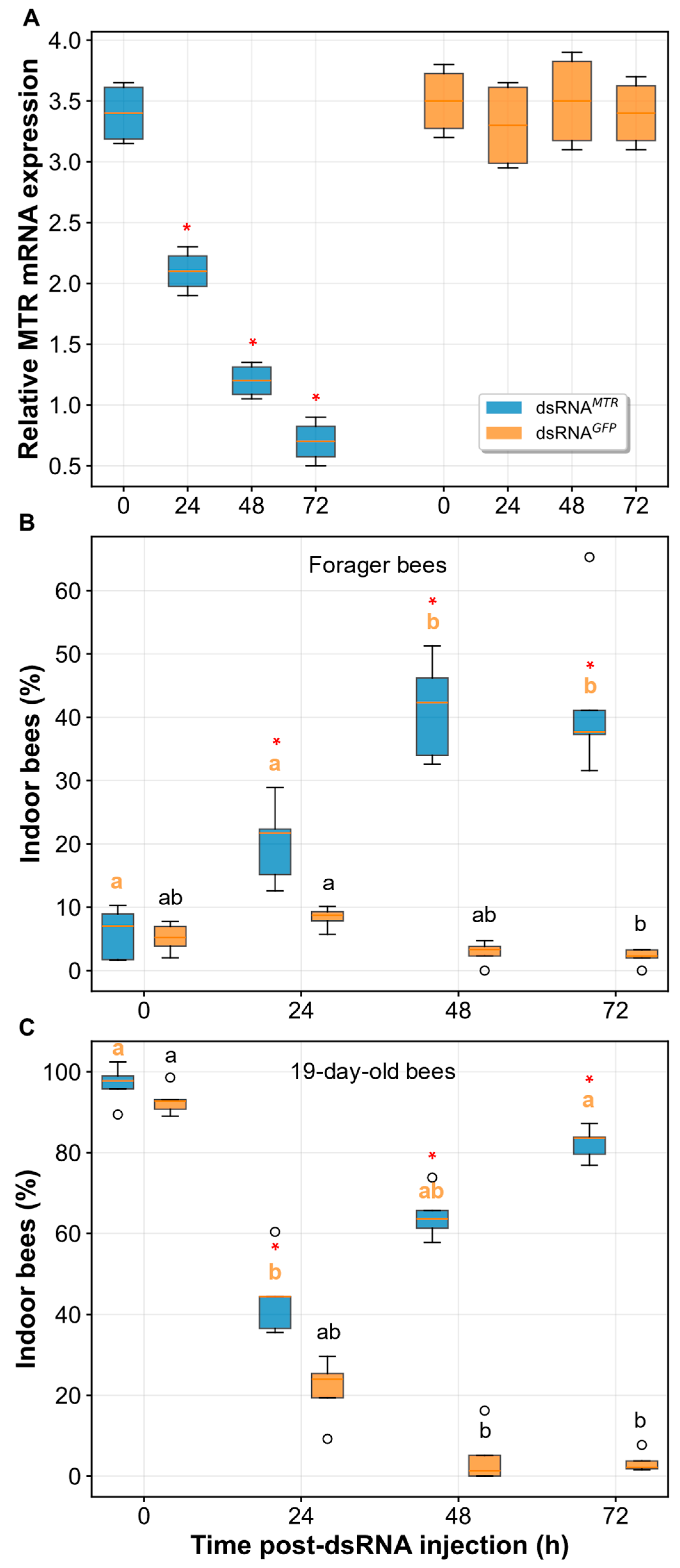 For melatonin, luzindole, and MTR knockdown experiments, indoor hive activity was quantified by recording the number or percentage of marked bees remaining inside the hive. Forager activity was assessed daily during the peak foraging window (14:00–15:00 h), a period characterized by stable and robust flight activity at the hive entrance. Nurse bee activity was monitored over several days post-injection as specified in the results.