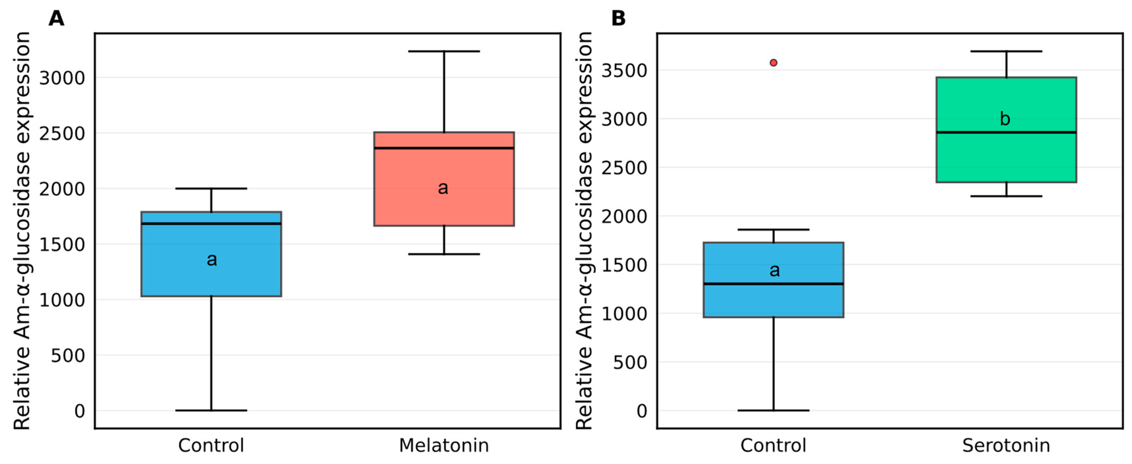 To validate gene knockdown efficiency, MTR mRNA expression levels following dsRNA-MTR injection were compared to those in dsRNA-GFP (control)-injected groups at individual time points using Mann–Whitney U tests. To evaluate the impact of neurochemicals on gene expression, the effects of melatonin and serotonin on Amα-glucosidase mRNA levels were assessed. Specifically, 7-day-old bees injected with 100 ng melatonin were compared to uninjected controls 24 h post-injection using a Mann–Whitney U test. Similarly, 23-day-old foragers injected with 1 pmol serotonin (in 5 µL dH2O) were compared to vehicle-injected controls (5 µL dH2O alone) using a Mann–Whitney U test. Finally, the effect of bee age on Amα-glucosidase and AmNATs expression levels was examined using Kruskal–Wallis tests. When a significant main effect was detected, Dunn’s post hoc tests with Bonferroni correction were conducted for pairwise comparisons between age groups.