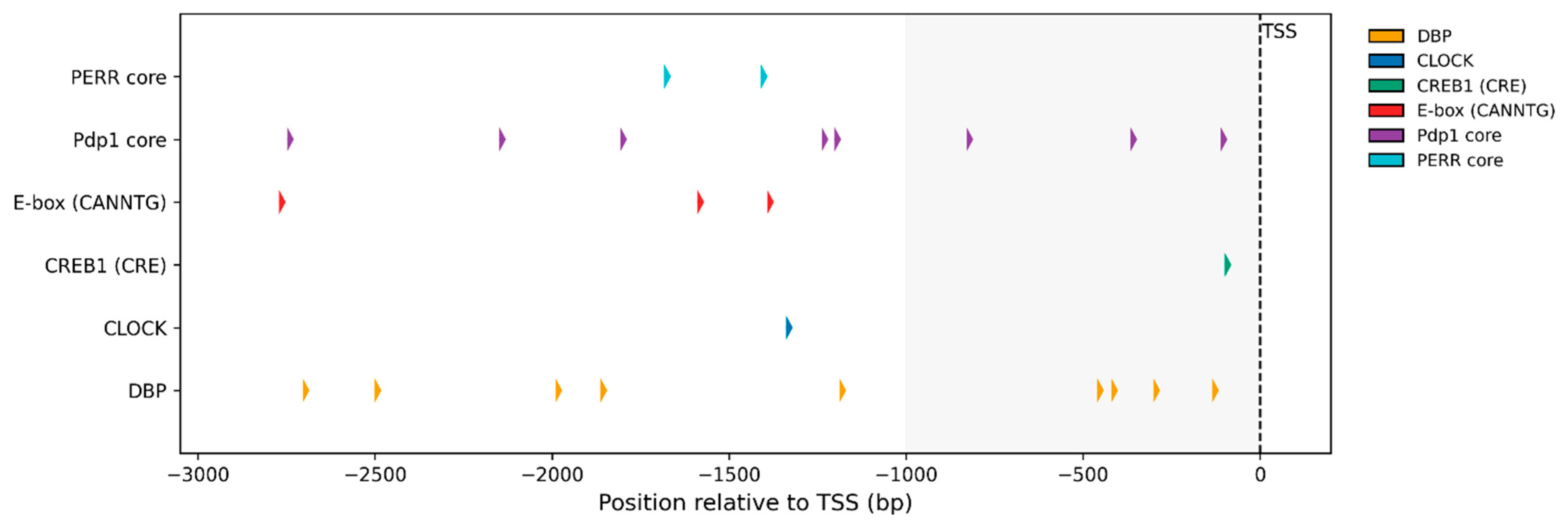 70] for canonical circadian regulators (CLOCK/BMAL1 E-box, DBP D-box, CREB1 CRE, ROR elements). We retained high-confidence PWM matches using a relative PWM score threshold ≥ 0.85; all retained hits were re-verified against the genomic FASTA and reported as coordinates relative to the annotated TSS (negative values = upstream). Because this analysis was implemented as a focused PWM scoring procedure on the extracted promoter sequence rather than a genome-wide FIMO run, we did not report per-site FIMO