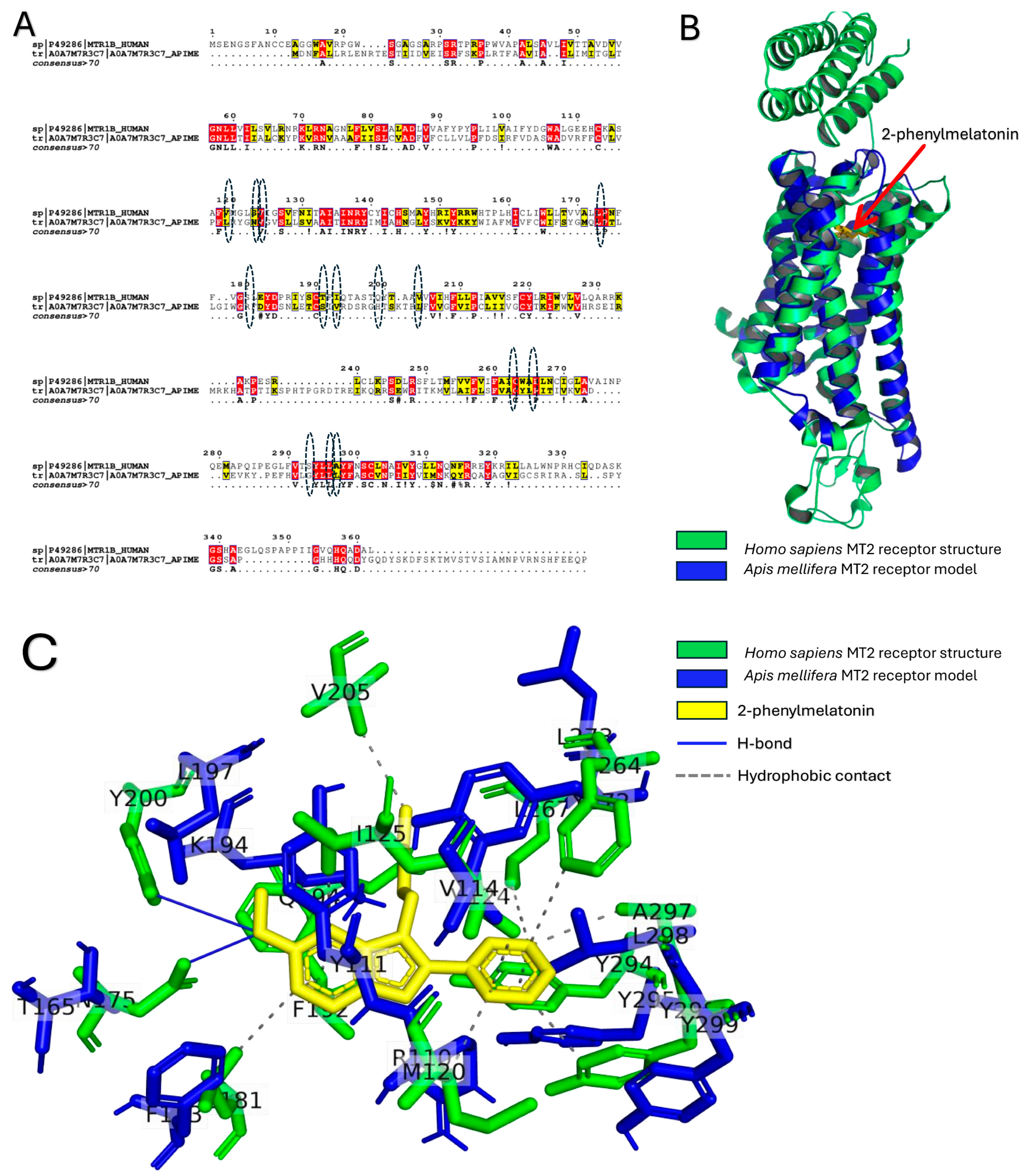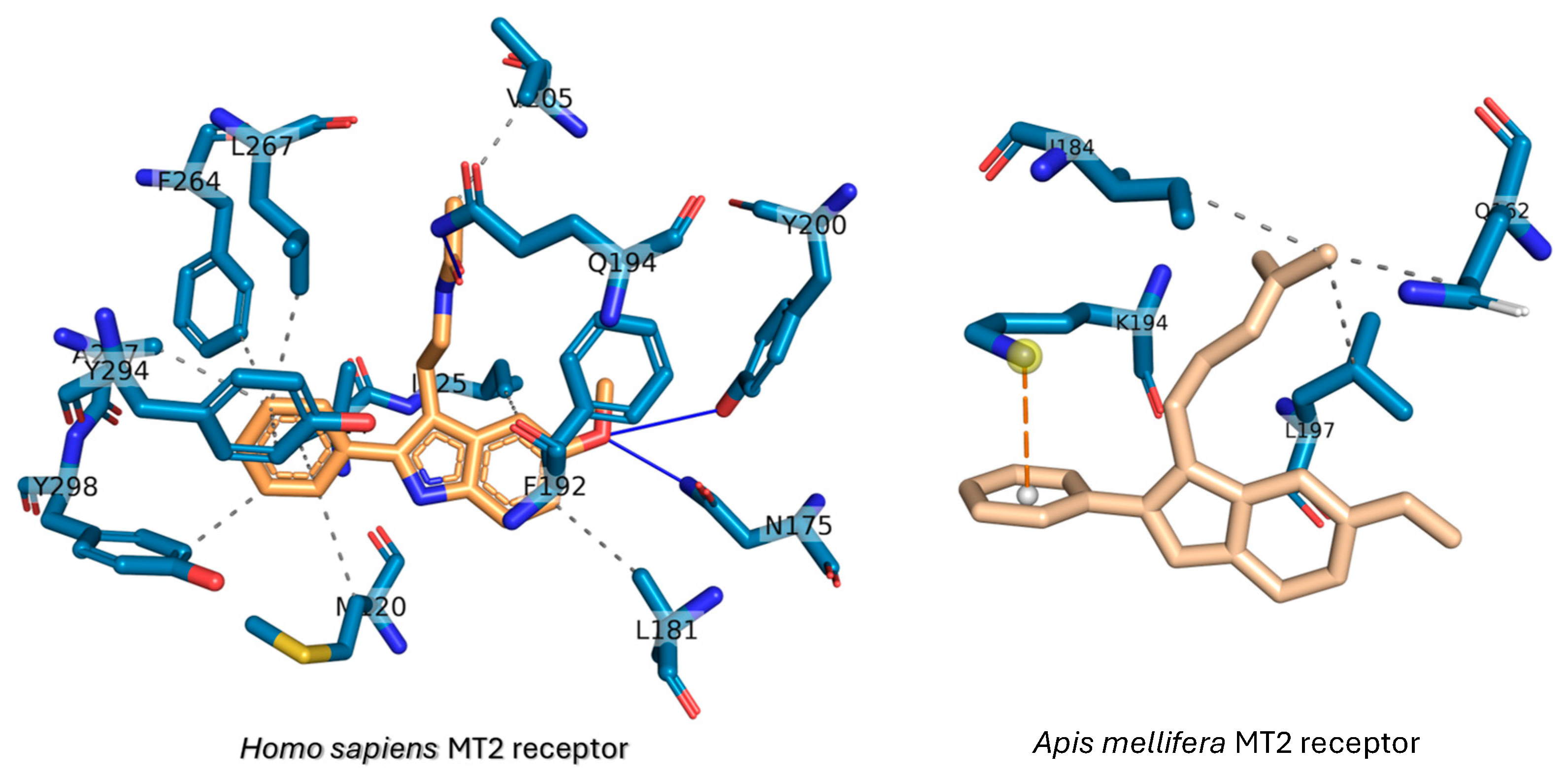 To generate testable receptor hypotheses we built atomistic models of the putative honey bee melatonin receptor (AmMTR) using contemporary deep-learning/GPCR refinement and benchmarked these against human MT2 X-ray structures [