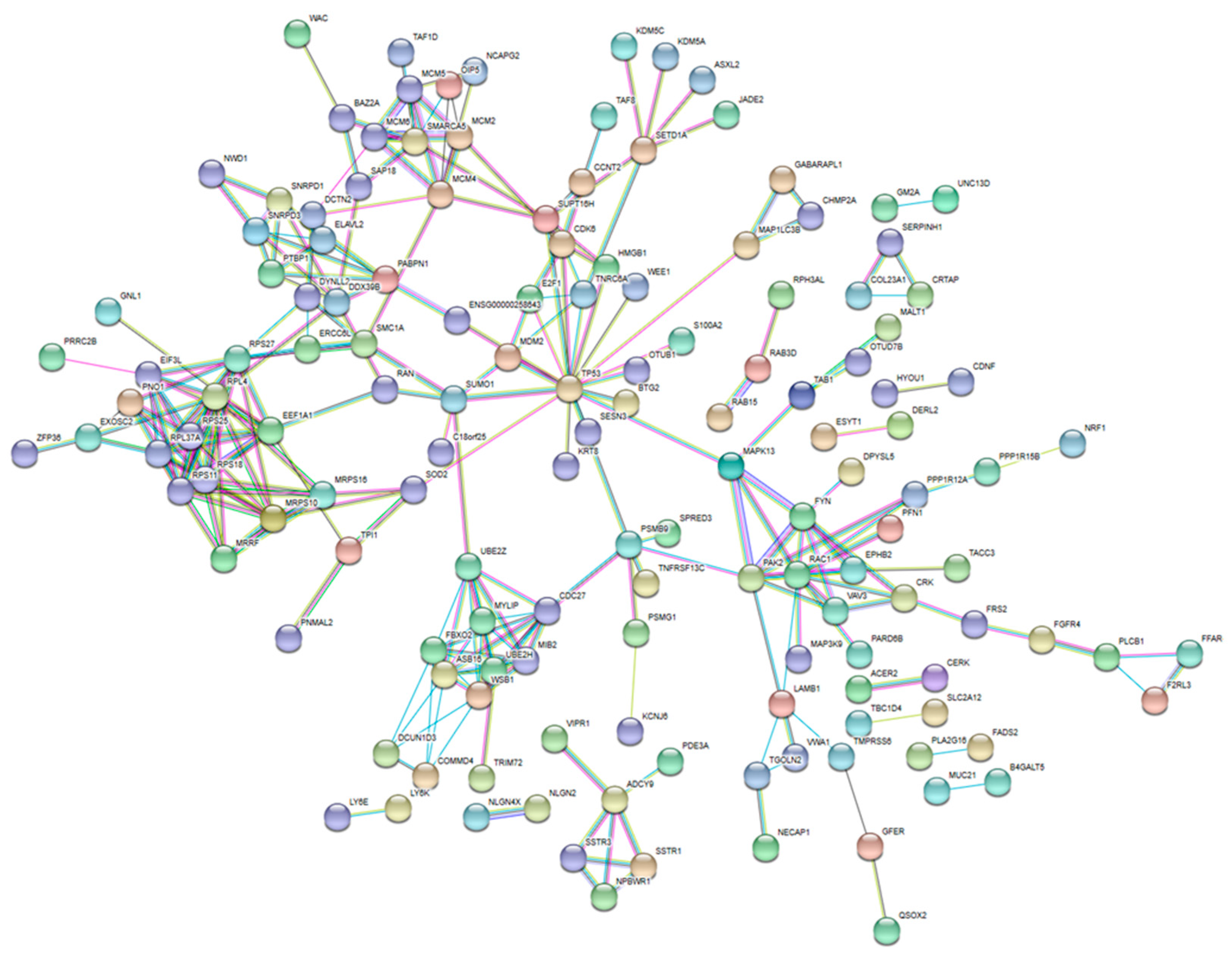 2.4. Analysis of Protein–Protein Interactions and Hub Proteins