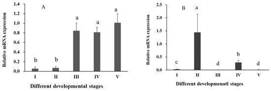 Expression of Sp-RBX1 during different development stages in ovaries and hepatopancreas. Note: (A), expression in ovary, I–V: five stages of ovarian development; (B), expression in hepatopancreas, I–V: five stages of hepatopancreatic development. Different letters on the graph indicate significant differences (p < 0.05).