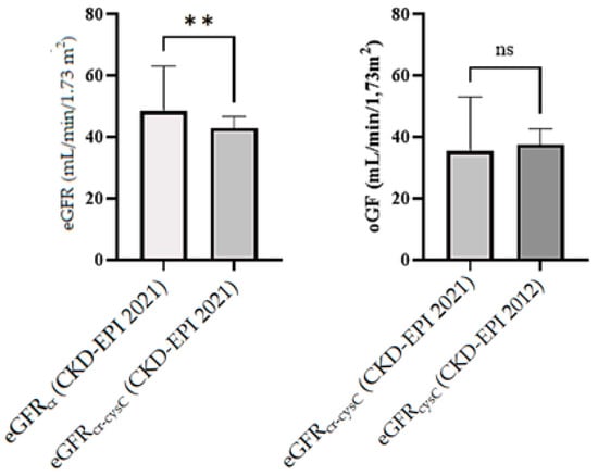 - Wilcoxon tests did not confirm statistically significant differences between eGFRcysC and eGFRcr-cysC (p = 0.0553) and between eGFRcr and eGFRcr-cysC (p = 0.0285).