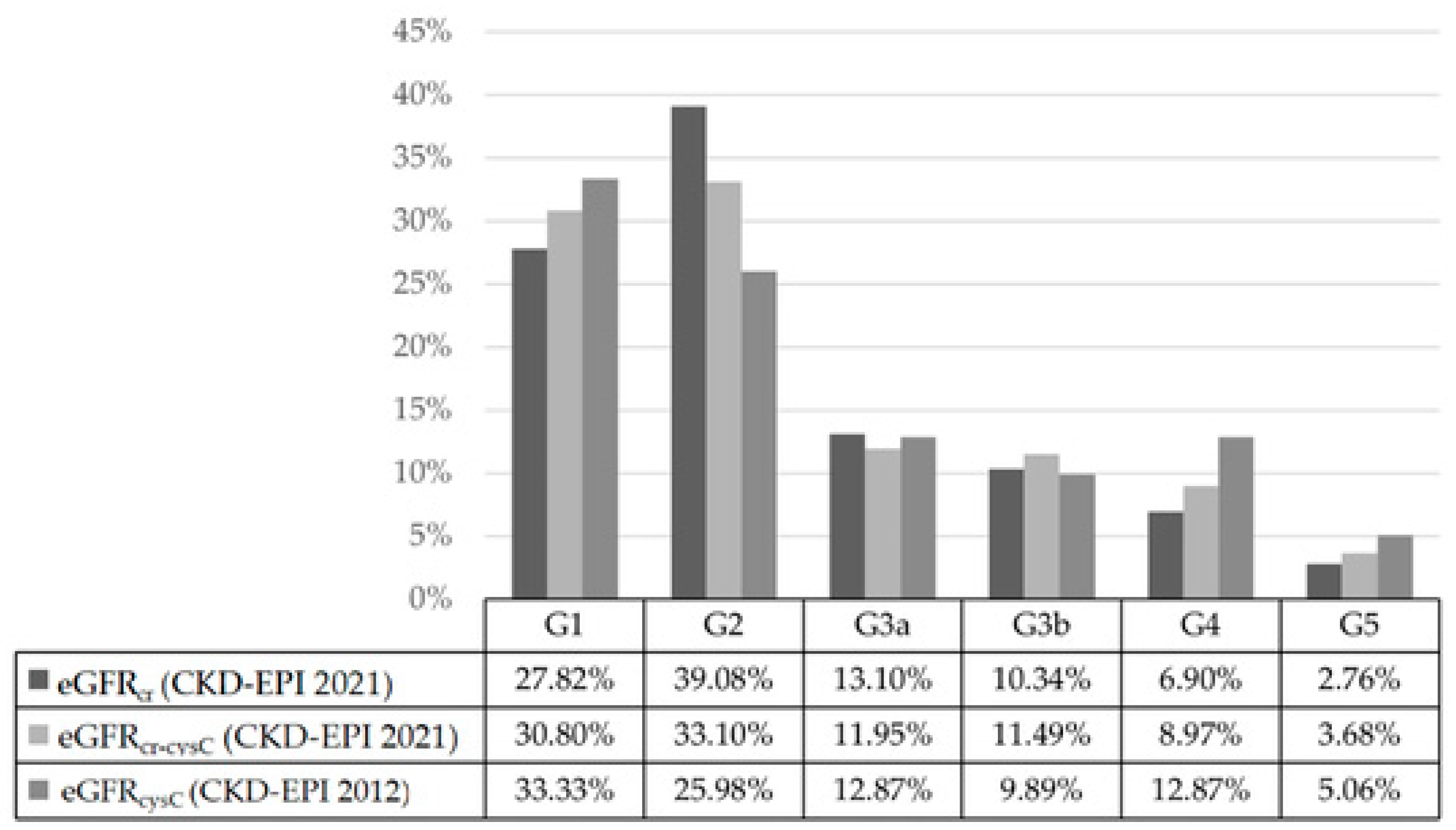 - Shlipak, M.G.; Matsushita, K.; Ärnlöv, J.; Inker, L.A.; Katz, R.; Polkinghorne, K.R.; Rothenbacher, D.; Sarnak, M.J.; Astor, B.C.; Coresh, J.; et al. Cystatin C versus Creatinine in Determining Risk Based on Kidney Function. N. Engl. J. Med. 2013, 369, 932–943. [Google Scholar] [CrossRef] [PubMed]