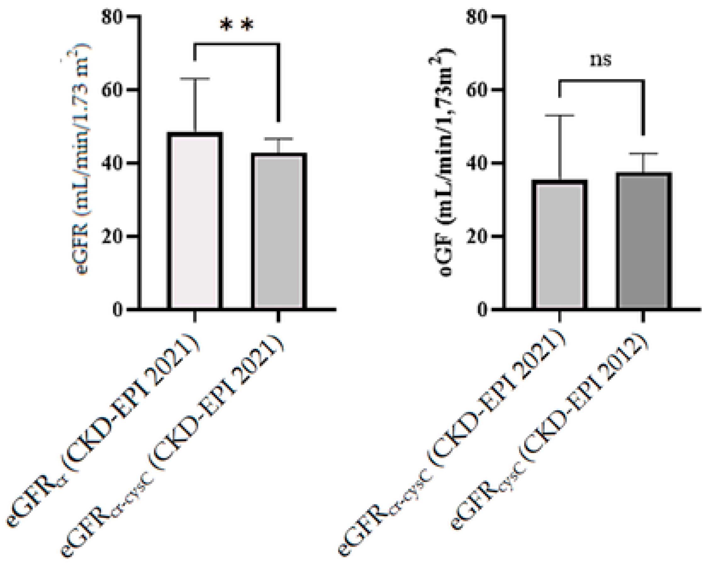 - Two- tailed paired t-test confirmed statistically significant differences between eGFRcr and eGFRcr-cysC (p = 0.006).