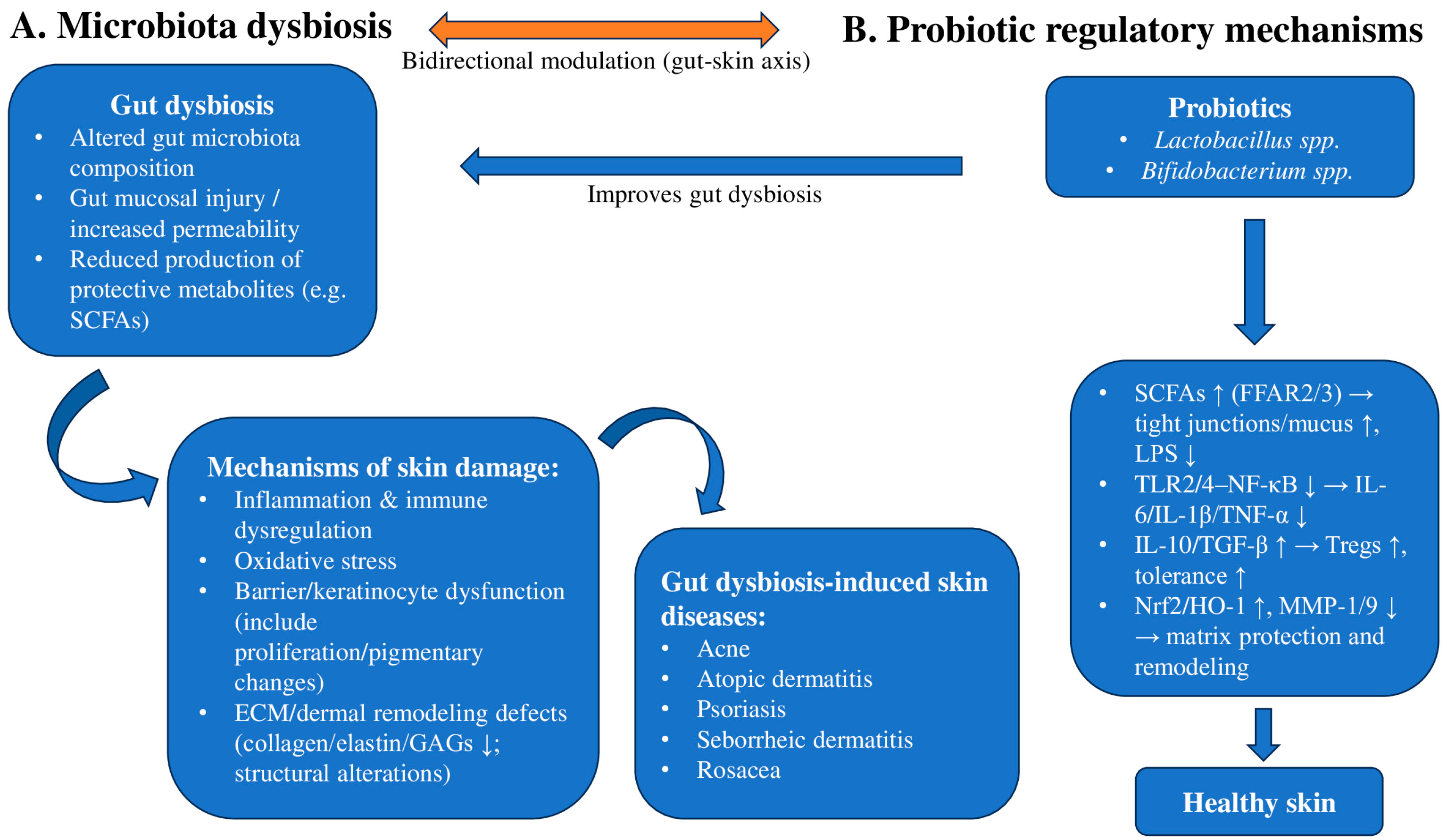 - Zhao, Y.; Yu, C.; Zhang, J.; Yao, Q.; Zhu, X.; Zhou, X. The Gut-skin Axis: Emerging Insights in Understanding and Treating Skin Diseases through Gut Microbiome Modulation (Review). Int. J. Mol. Med. 2025, 56, 210. [Google Scholar] [CrossRef] [PubMed]