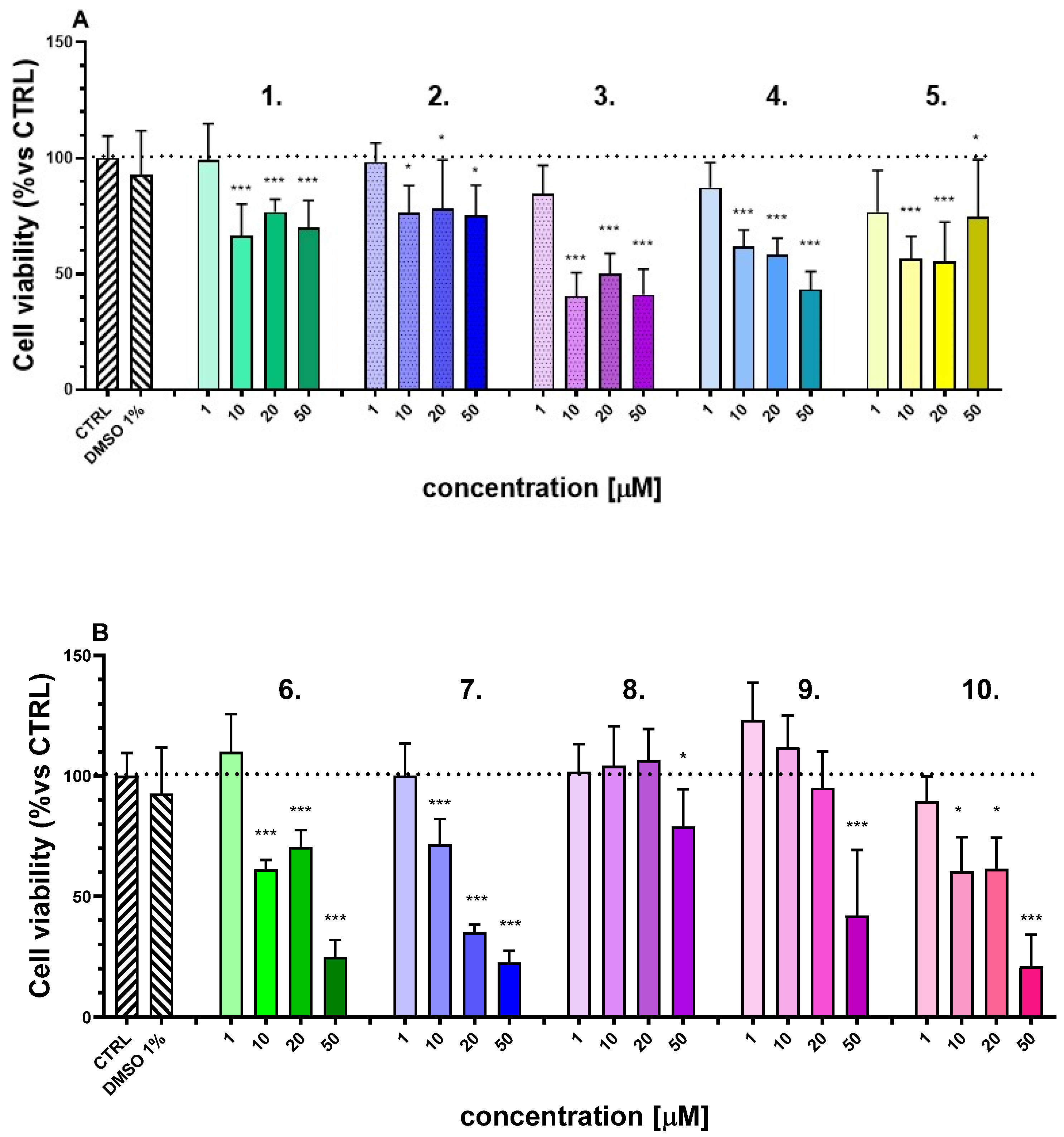 Following the in vitro toxicity evaluation, the specific non-toxic concentrations of the compounds, i.e., the highest concentration that did not produce a significant reduction in cell viability after 24 h of treatment, were identified and selected for further experimental investigation (