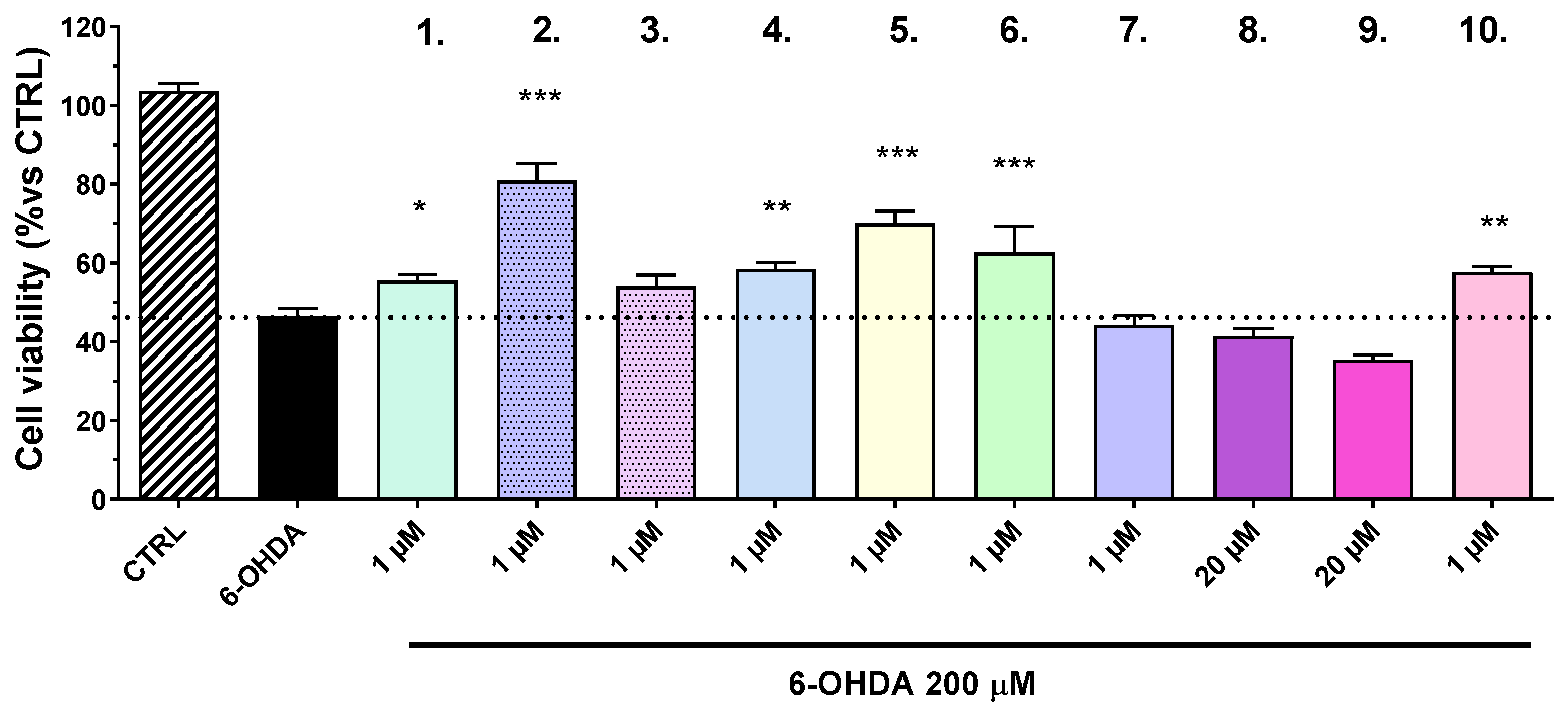 6 significantly increased cell viability in the presence of 6-OHDA, suggesting they can mitigate its cytotoxic effects. Compounds