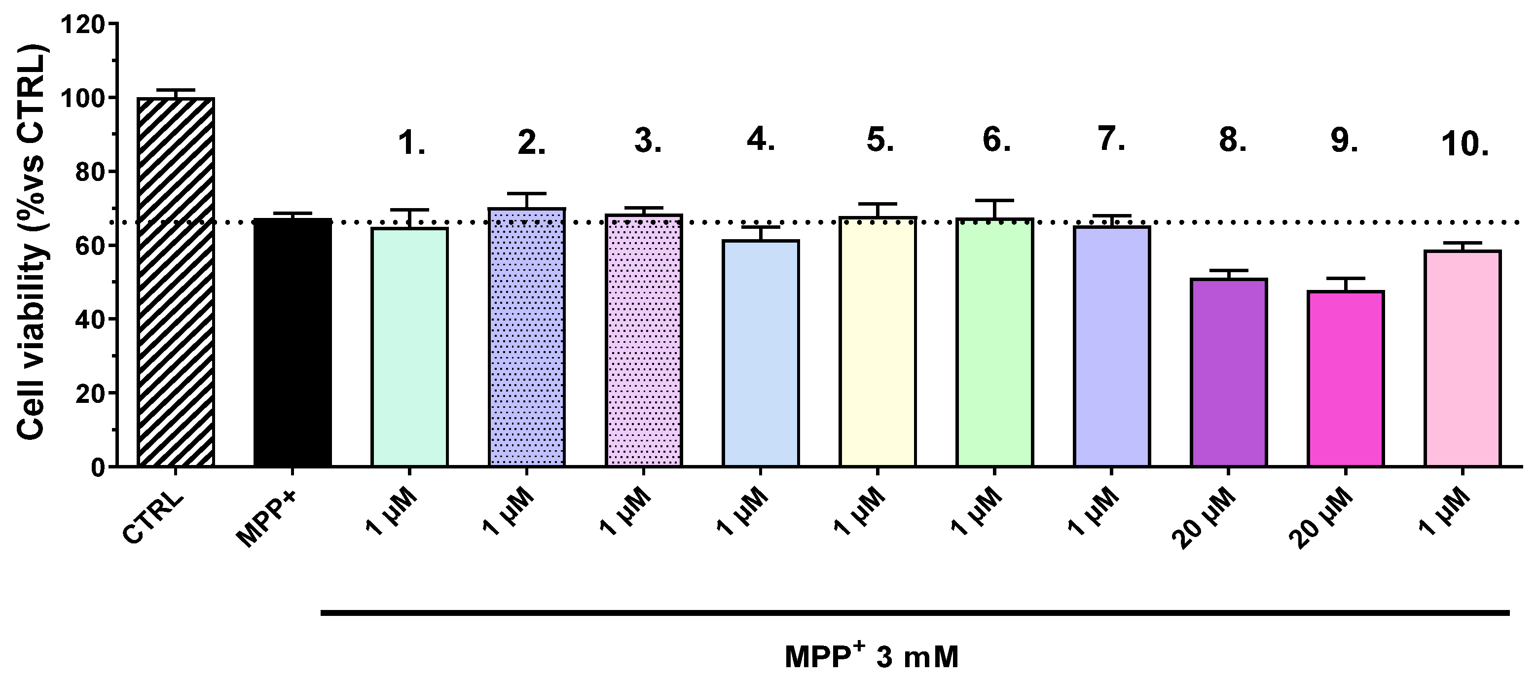 + localizes to mitochondria, where it inhibits complex I of the electron transport chain, leading to ATP depletion, increased oxidative stress, and ultimately, neuronal cell death. Interestingly, none of the tested compounds exhibited neuroprotective effects in the MPP