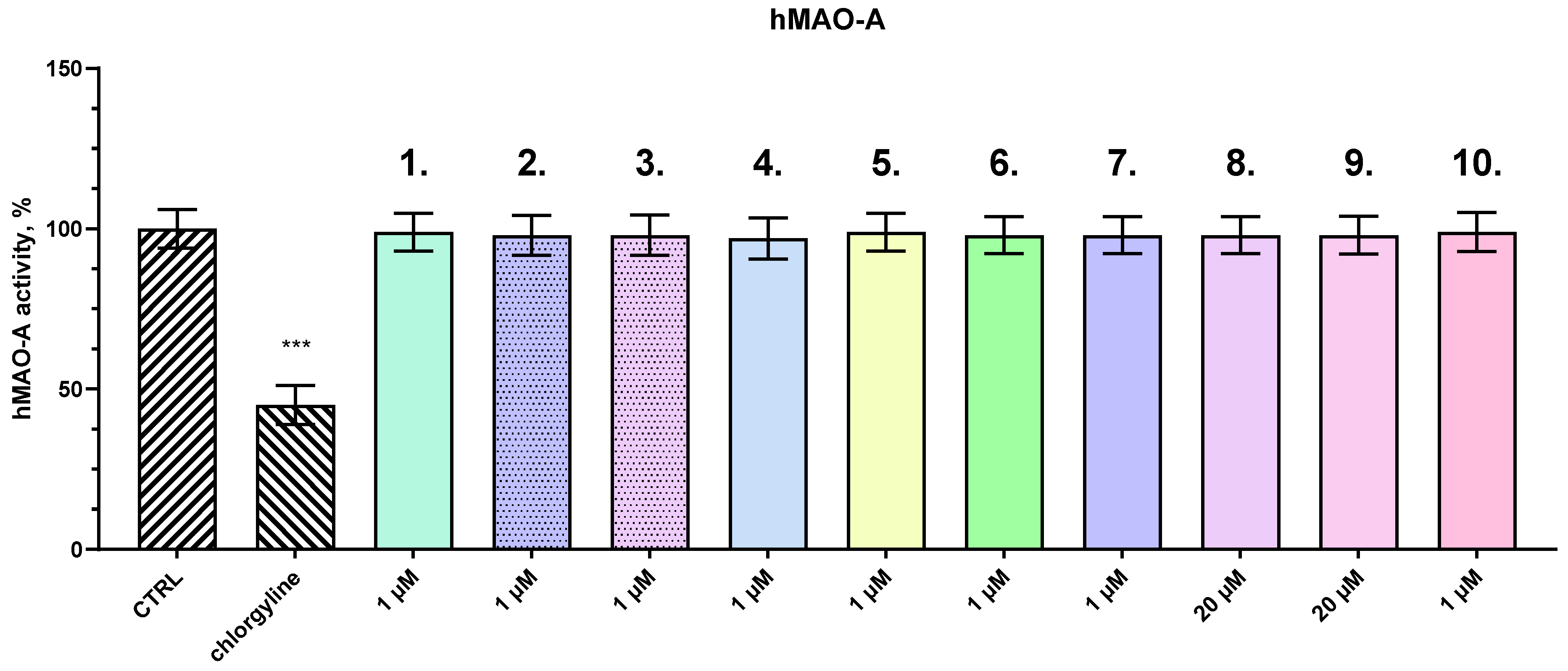 To evaluate the potential inhibitory effects of the tested compounds on human monoamine oxidase A (hMAO-A), an in vitro enzyme inhibition assay was conducted. In our previous studies, a concentration of 1 µM was used to determine the inhibitory effect on human recombinant MAO-A and MAO-B enzymes [