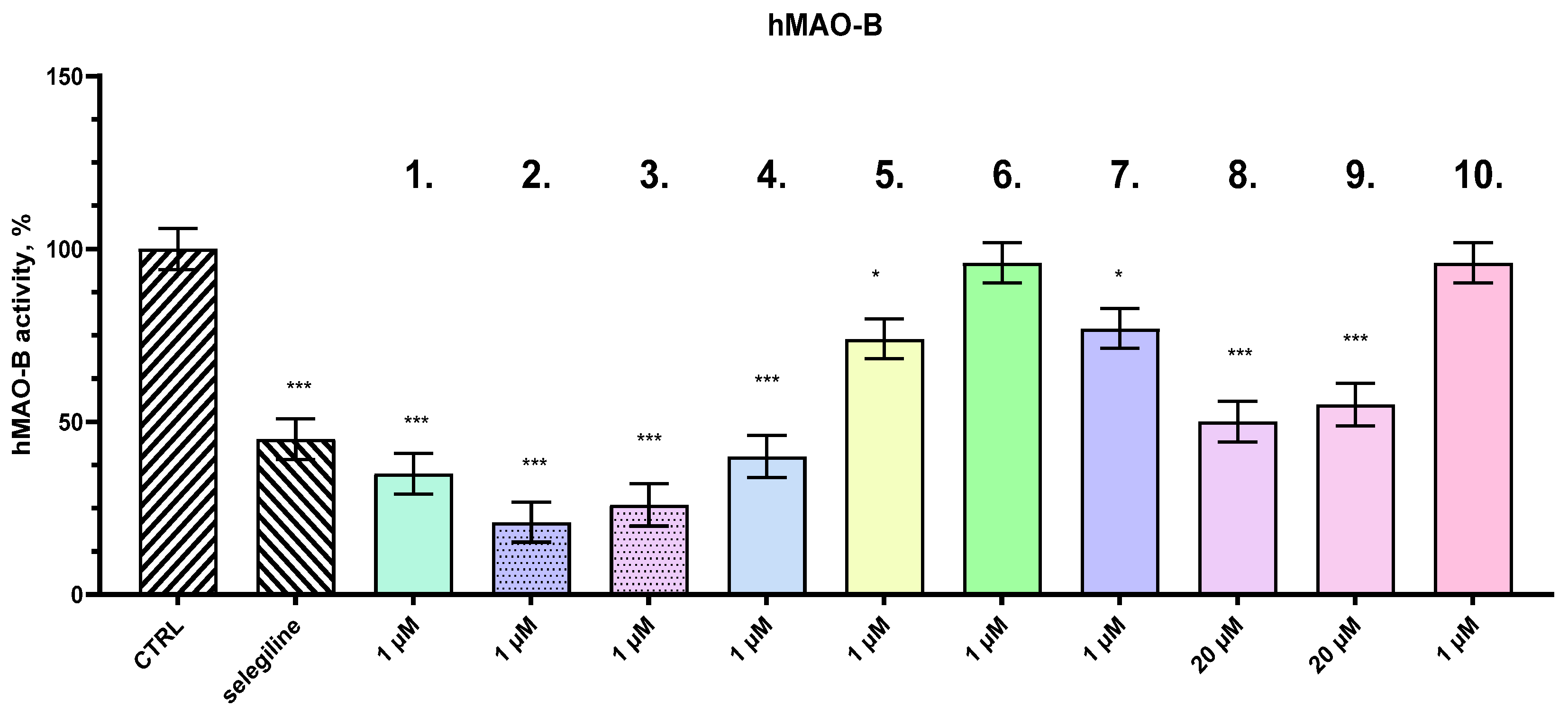 Figure 5, indicate that a subset of the compounds achieved notable reductions in hMAO-B activity, with inhibition levels surpassing that of selegiline, which inhibited the enzyme by 55%.