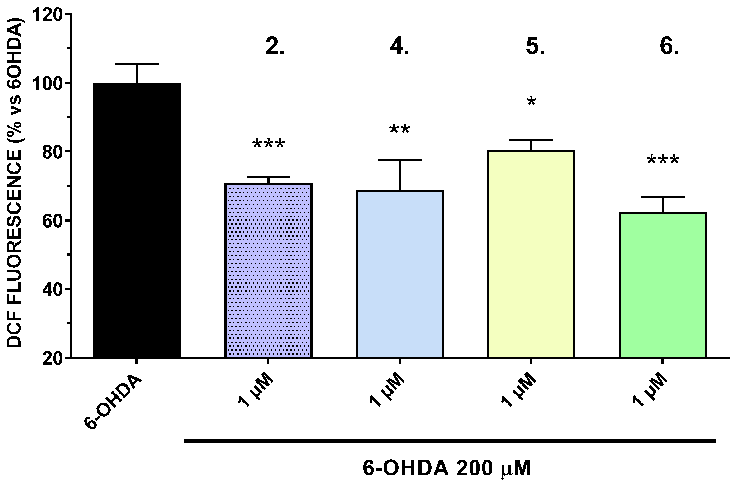 The neurotoxic effects of 6-OHDA are primarily attributed to its ability to generate ROS, leading to oxidative stress and subsequent neuronal damage. By attenuating ROS production, the tested compounds may offer neuroprotective benefits, potentially through mechanisms involving the scavenging of free radicals or the enhancement of endogenous antioxidant defenses. In this study, the intracellular production of reactive oxygen species (ROS) was assessed in the SH-SY5Y cell line, focusing on the most active compounds (