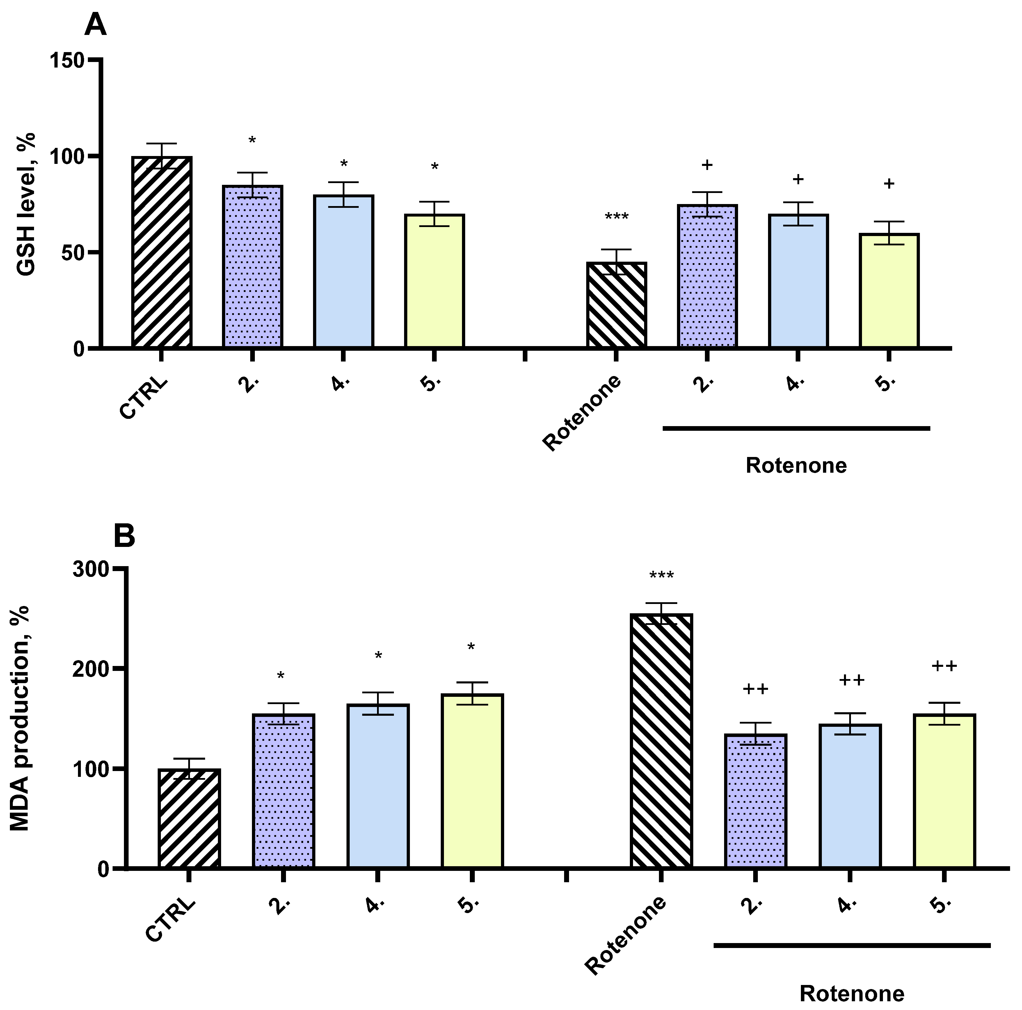 We observed a strong in vivo antioxidant effect in our experiments, which is consistent with our in vitro findings. Together, these results suggest that the compound has a robust neuroprotective mechanism. Biochemical assays revealed that co-administration of the compounds with rotenone significantly preserved GSH levels and reduced MDA, a marker of lipid peroxidation [