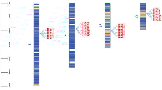 Chromosomal location of HOX gene family in donkeys. The color on the chromosome represents the size of gene density in the 1 MB window, blue represents the region with low gene density, and red is the opposite.