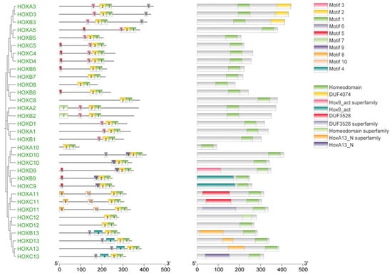 Phylogenetic tree, motif and domain relationship of donkey HOX gene family.