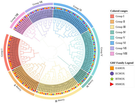 The phylogenetic tree clustered 145 HOX genes into eight subfamilies (Group I to Group VIII). HOX gene family members from the four species clustered together within each subfamily, indicating close evolutionary relationships and potential functional conservation. Each subfamily contained orthologous gene pairs between donkey and horse. Group II contained the fewest orthologous pairs (one pair: HOXD13), while Group III contained the most (five pairs: HOXB3, HOXD3, HOXA1, HOXB1, and HOXD1). Groups IV and VII each contained two pairs, while Groups I, V, VI, and VIII each contained three pairs.
