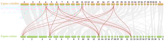 Collinear analysis of HOX gene family in Equus asinus and Equus caballus. The gray line represents all collinearity blocks of the whole genome; The red line represents the collinearity of HOX gene family.