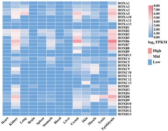 Notable expression patterns included the following: HOXB2 and HOXB3 showed high expression in heart, spleen, and liver. HOXB6 and HOXB7 were highly expressed in kidney and stomach. HOXA3 exhibited the highest expression in lung. Most HOX family members showed low expression levels (FPKM < 1) in brain. HOXB6 showed the highest expression in blood, cecum, and epididymis. HOXC13, HOXA5, and HOXB7 were highly expressed in skin. HOXC8, HOXC9, HOXC10, HOXD8, and HOXD9 showed high expression in muscle. HOXD8 exhibited the highest expression in testis.