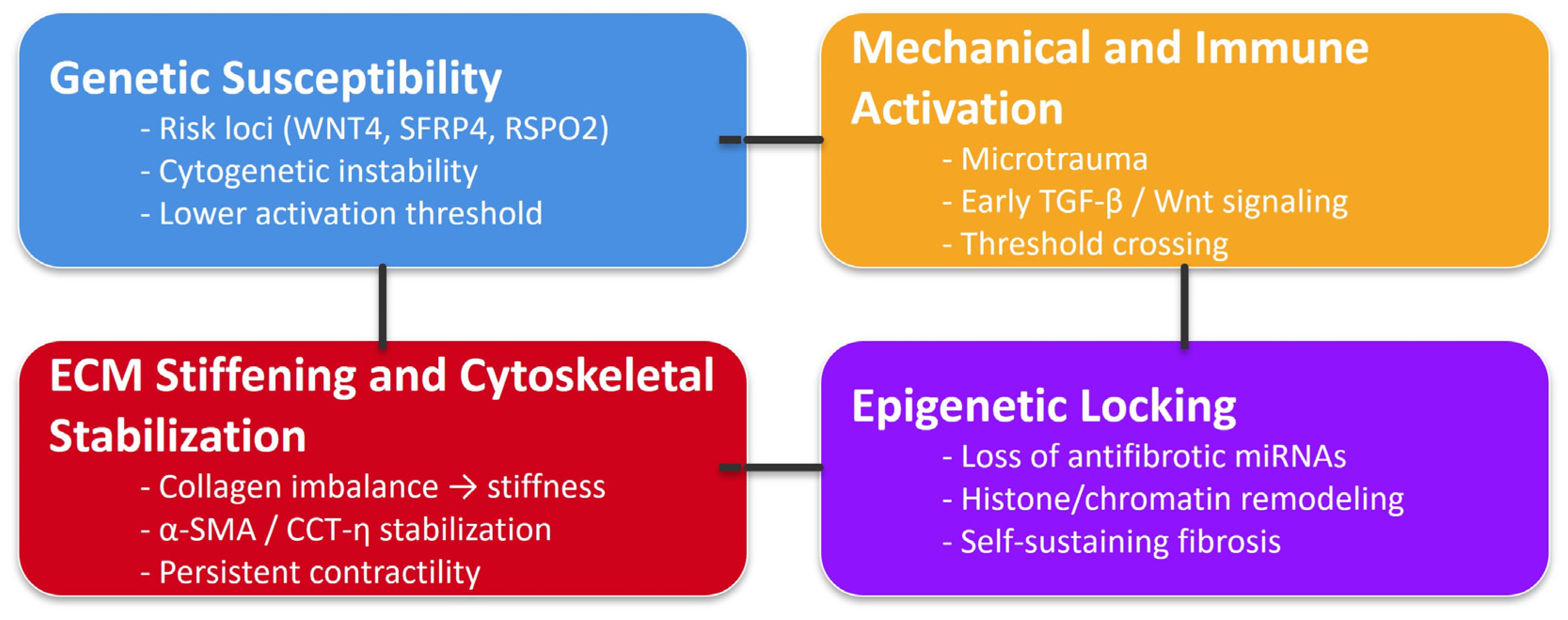 | Early GWAS findings | Susceptibility loci identified in Wnt signaling and extracellular matrix (ECM)-related genes | [20] | Demonstrates convergence between genetic risk and profibrotic molecular pathways |