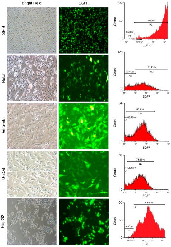 A recombinant AcMNPV containing dual promoters was created and designated vAcMBac-CMV-IE-EGFP. This construct harbors an EGFP expression cassette whose activity is driven by both the CMV-IE and Pph promoters (Figure 1), as detailed in the Materials and Methods Section. The ability of vAcMBac-CMV-IE-EGFP to infect both insect cells and mammalian cells was evaluated by assessing EGFP expression using fluorescence microscopy and flow cytometry after 48 h of viral infection at a multiplicity of infection (MOI) of 500. The transduction efficiency in the insect cell line Sf-9 reached 95.52 ± 4.86%, while the efficiencies achieved in the mammalian cell lines HeLa, Vero E6, U-2 OS, and HepG2 were 60.87 ± 2.59%, 80.87 ± 2.50%, 70.14 ± 1.70%, and 80.53 ± 3.31%, respectively (Figure 2 and Table 1). The observation of over 50% transduction efficiency in Sf-9 cells and in most tested mammalian cell lines indicates that both the polyhedron (Pph) and CMV-IE promoters in the viral construct were functionally active.