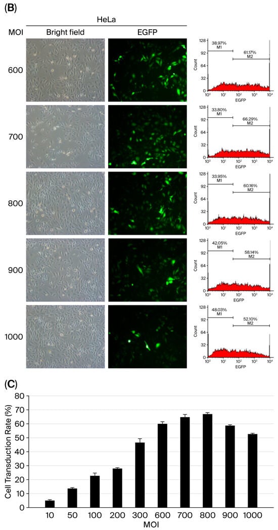The transduction efficiency of baculoviral vectors is influenced by inoculation parameters such as viral load and exposure duration. To determine the optimal conditions for baculovirus-mediated gene delivery in mammalian cells, we used HeLa cells due to their intermediate transduction efficiency (60.87 ± 2.59%) at an MOI of 500, as previously described in Figure 2. A range of viral doses (MOI 10 to 1000) was tested, and transduction efficiency was assessed by quantifying EGFP-positive cells using flow cytometry and fluorescence microscopy at 48 h p.i. The results showed a progressive increase in transduction efficiency with an increasing MOI (Figure 5A,B), reaching a peak of 64.41% at an MOI of 700. However, efficiency declined to 51.35% at MOI 1000 (Figure 5C), suggesting there is a threshold beyond which higher viral loads may reduce transduction performance.