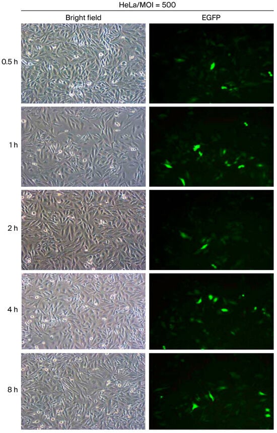 Prolonging the virus incubation period is generally expected to enhance transduction efficiency. However, the optimal incubation duration at a given viral dosage remains to be defined. In this study, HeLa cells were inoculated with vAcMBac-CMV-IE-EGFP at a multiplicity of infection (MOI) of 500 and incubated with gentle rocking for 0.5, 1, 2, 4, or 8 h to determine the optimal exposure time. The transduction efficiency was 44.8% after 0.5 h of incubation and increased to 50.4%, 60.7%, and 60.3% following 1, 2, and 4 h of incubation, respectively. However, extending the incubation period to 8 h resulted in a slight decline in efficiency to 56.2% (Figure 6 and Table 3). According to these results, transduction efficiency in mammalian cells, as evaluated in HeLa cells, was optimal at an MOI of 600–800 with a 2–4 h incubation period in which gentle rocking was employed.