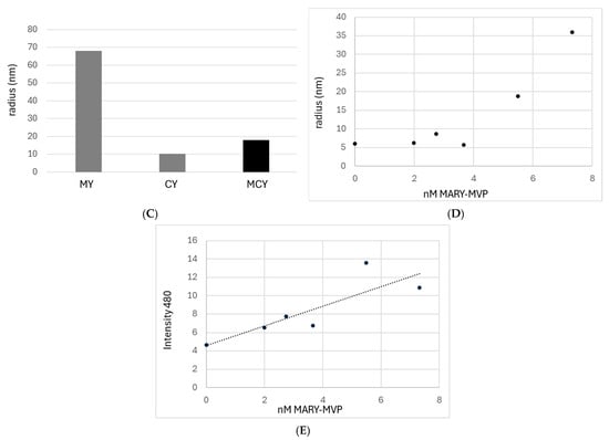 As shown in Figure 5E, a linear increase in CFP fluorescence is observed as the [MARY-MVP] is increased. At ~5 nm [MARY-MVP], DLS observes a sharp transition from monomeric MARY-MVP to VLP formation (Figure 5D). This inflection point in radius is not associated with a concordant deviation in CFP emission intensity, but instead, CFP fluorescence continues to increase linearly as a function of [MARY-MVP]. This result is consistent with previous studies loading GFP into the hollow vault interior, where fluorescence is preserved upon loading [8].
