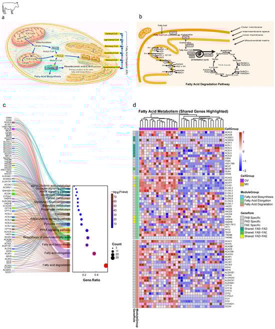 Remodeling of mitochondrial lipid metabolism pathways during bovine oocyte maturation. (a) De novo fatty acid biosynthesis in the cytosol generates hexadecanoic acid (palmitic acid; C16:0) as the central metabolic hub. Palmitoyl-CoA is subsequently elongated in the endoplasmic reticulum by the ELOVL enzyme family in sequential +2-carbon cycles, producing long- and very-long-chain fatty acyl-CoAs (C18–C26). (b) Fatty acid degradation (β-oxidation) and energy generation. Pathway highlights: (1) carnitine shuttle (*CPT1/2*), (2) β-oxidation cycle (VLCAD, HADHA/B), (3) TCA cycle and oxidative phosphorylation (ATP synthase). (c) Functional annotation of lipid metabolism genes. Left: Sankey diagram linking genes to pathways (Fatty Acid Biosynthesis [FAB], Elongation [FAE], Degradation [FAD]). Shared genes are color-coded. Right: Dot plot of enriched pathways (GeneRatio vs. −log10(p-value)). (d) Dynamic expression of lipid metabolism genes across maturation. Heatmap of genes grouped by pathway (FAB, FAE, FAD). Color scale: Z-score of expression (red: upregulated; blue: downregulated). Shared genes are annotated.