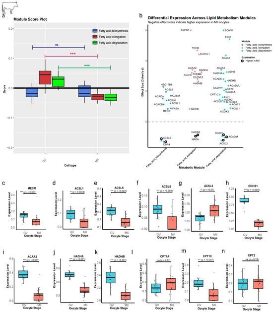 Stage-specific regulation of lipid metabolism genes and pathways in bovine oocytes. (a) Pathway activity scores by maturation stage. Module scores reveal reduced Elongation and Degradation (p < 0.01) in MII, while Biosynthesis remains stable (ns). (b) Effect-size analysis of module-specific genes. Dot plot of Cohen’s d effect size (GV vs. MII). Hollow circles: MII-enriched genes. Dashed line: null effect. (c–k) Stage-dependent expression of shared lipid metabolism genes. Box plots of genes shared between modules, showing significant downregulation from GV to MII. (l,m) CPT1 gene expression dynamics. Only CPT1C is significantly reduced in MII. (n) Stable CPT2 expression. CPT2 (critical for acylcarnitine-to-acyl-CoA conversion) shows no significant change (ns). Statistical significance is indicated as ** p < 0.01, *** p < 0.001; ns, not significant (p > 0.05).
