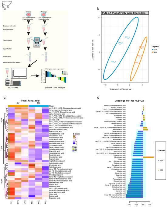 Stage-specific lipidomic signatures revealed by targeted metabolomics of bovine oocytes. (a) Workflow for targeted lipid metabolomics. Graphical abstract depicting (i) oocyte collection (GV/MII; 100 oocyte/replicate, 3 replicates/stage), (ii) methanol/MTBE extraction, (iii) saponification and derivatization, and (iv) LC-MS/MS analysis. (b) PLS-DA plot of fatty acid profiles. Clear separation of GV (blue) and MII (red) stages (X-variate 1: 43% explained variance; X-variate 2: 20%). Ellipses: 95% confidence intervals. (c) Clustered heatmap of 47 lipid metabolites. Hierarchical clustering of fatty acids across GV and MII replicates distributed into 3 main lipid categories: SFA, MUFA, and PUFA. Color scale: % change from baseline (red: upregulated; blue: downregulated). (d) PLS-DA loadings plot Metabolites driving stage separation: GV-associated (left blue; loading < −0.2): 38 metabolites. MII-associated (right orange; loading > 0.1): 9 metabolites.