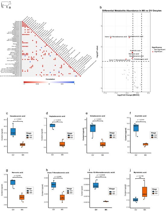Stage-specific lipid metabolite dynamics during bovine oocyte maturation. (a) Correlation network of significantly associated lipid metabolites. Heatmap showing pairwise correlations among all detected lipids (n = 47). Only significant correlations (p < 0.05) are displayed, with 7 negative correlations (blue; range: −1 to 0) and positive correlations (red; 0 to 1). (b) Volcano plot of differential metabolite abundance. (c–i) Quantification of downregulated metabolites in MII oocytes. Box plots (ng/cell). (j) Myristoleic acid (C14:1) shows nonsignificant upregulation in MII. Statistical significance is indicated as * p < 0.05, ** p < 0.01; ns, not significant (p > 0.05).