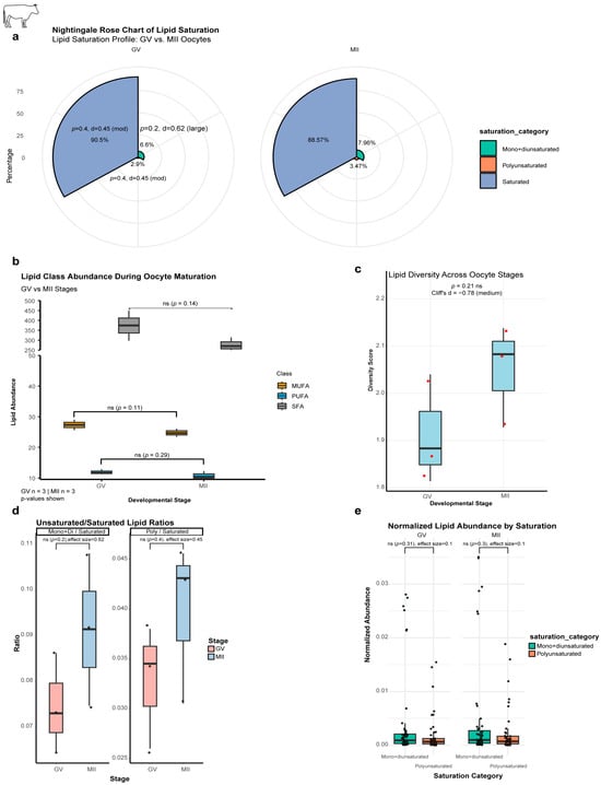 Lipid saturation remodeling during bovine oocyte maturation. (a) Nightingale Rose Chart of lipid saturation. Trends (%; non-significant): mono + diunsaturated (GV:6.6% → MII:7.9%); polyunsaturated (GV:2.9% → MII:3.5%); Saturated (GV:90.5% → MII:88.6%). (b) Lipid abundance by class (absolute quantities) exhibits global reductions (p > 0.05): SFA: 26% (GV:373.8 → MII:275.3); MUFA: 9% (GV:27.3 → MII:24.8); PUFA: 10% (GV:11.9 → MII:10.8). (c) Lipid diversity score: increased diversity in MII (GV:1.91 → MII:2.00; Cliff’s δ = −0.78 [moderate effect]). (d) Unsaturated/Saturated ratios; non-significant increases: mono+di/saturated: 22% (GV:0.075 → MII:0.091); poly/saturated: 21% (GV:0.033 → MII:0.040). (e) Normalized lipid abundance; non-significant trends: mono+di (GV:0.004 → MII:0.005); poly (GV:0.002 → MII:0.002). ns, not significant (p > 0.05).