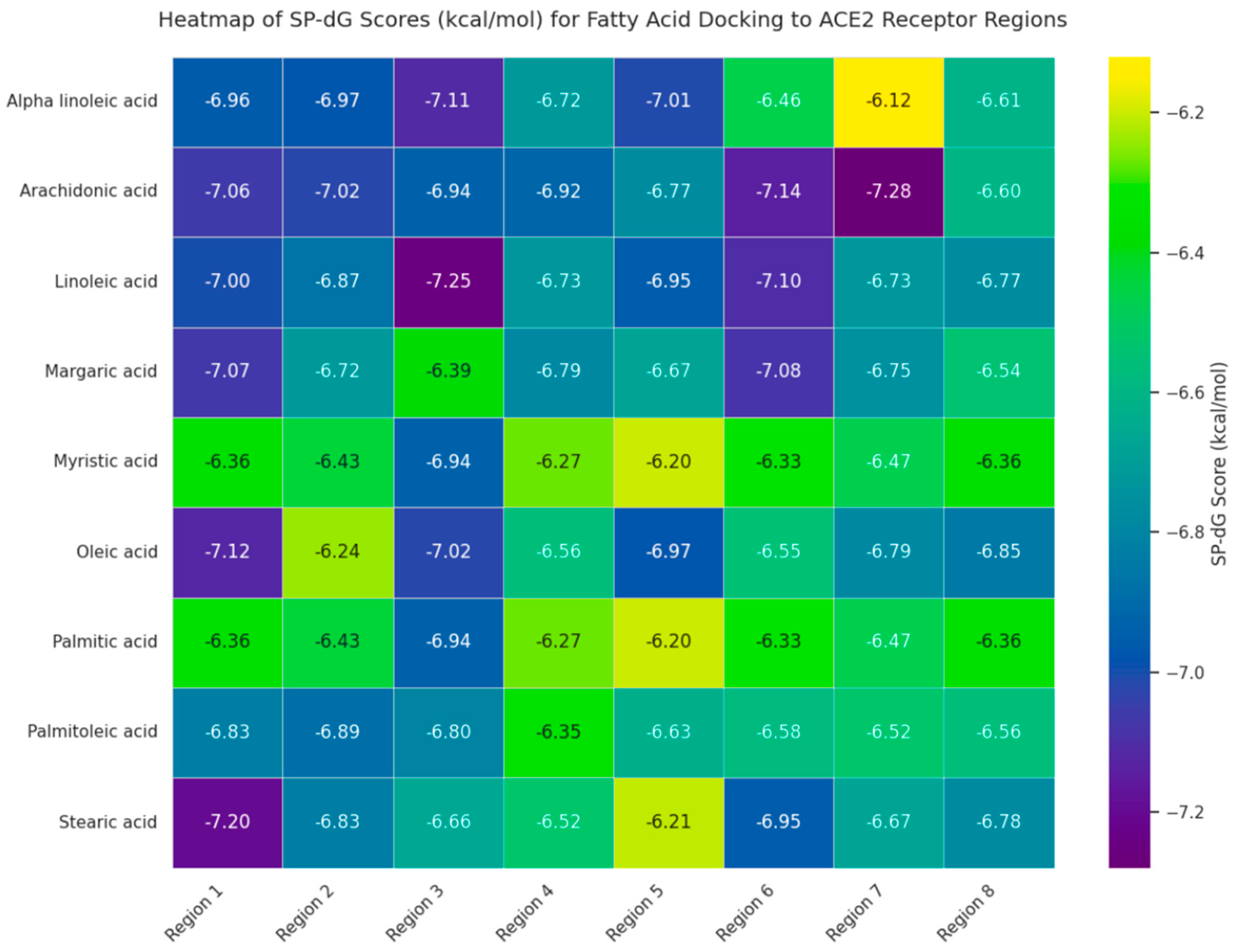 | Fatty Acid | ACE2 Region | SP-dG (kcal/mol) | Key Hydrophobic Contacts | C–H Bonds | H-Bonds | Salt Bridges |