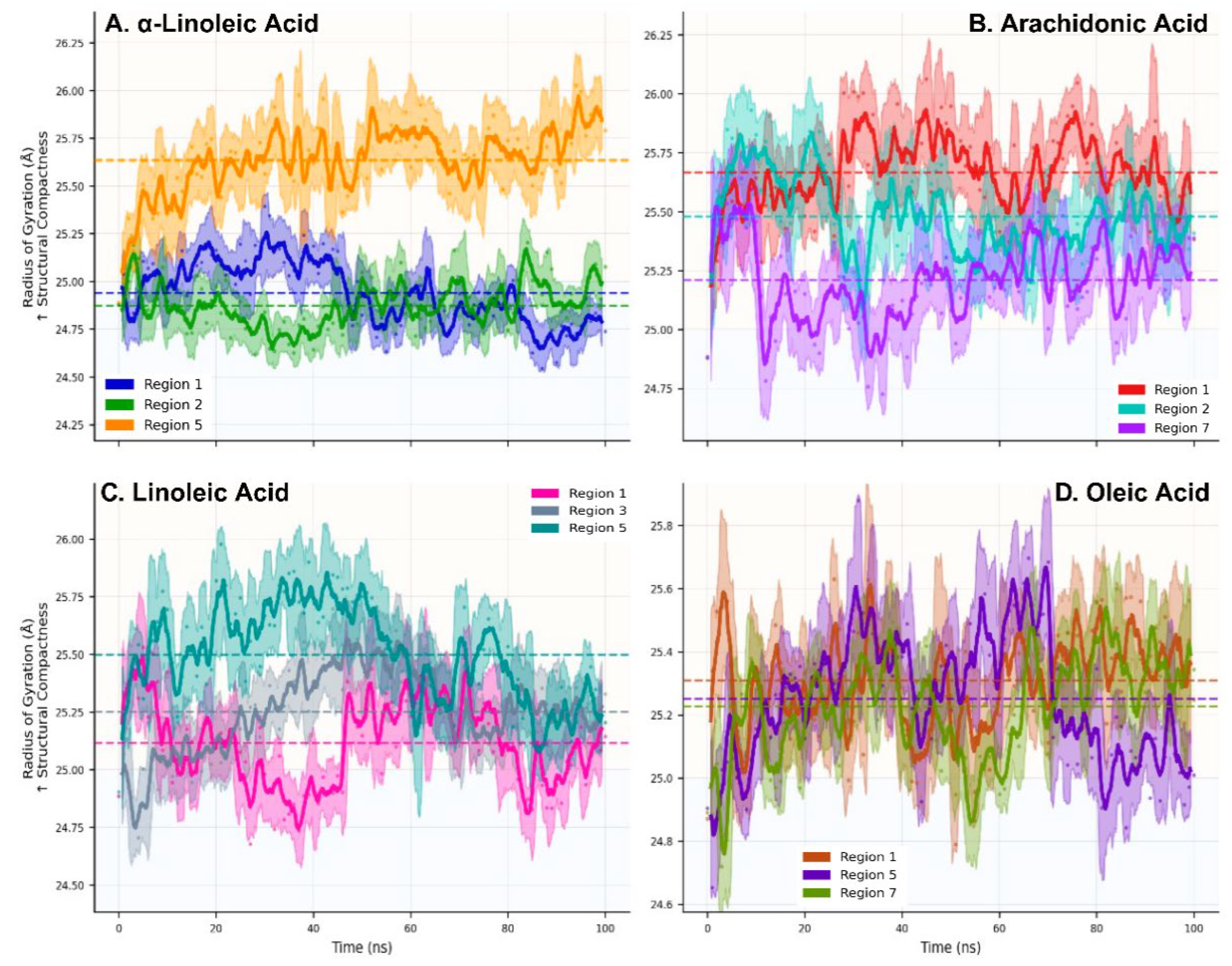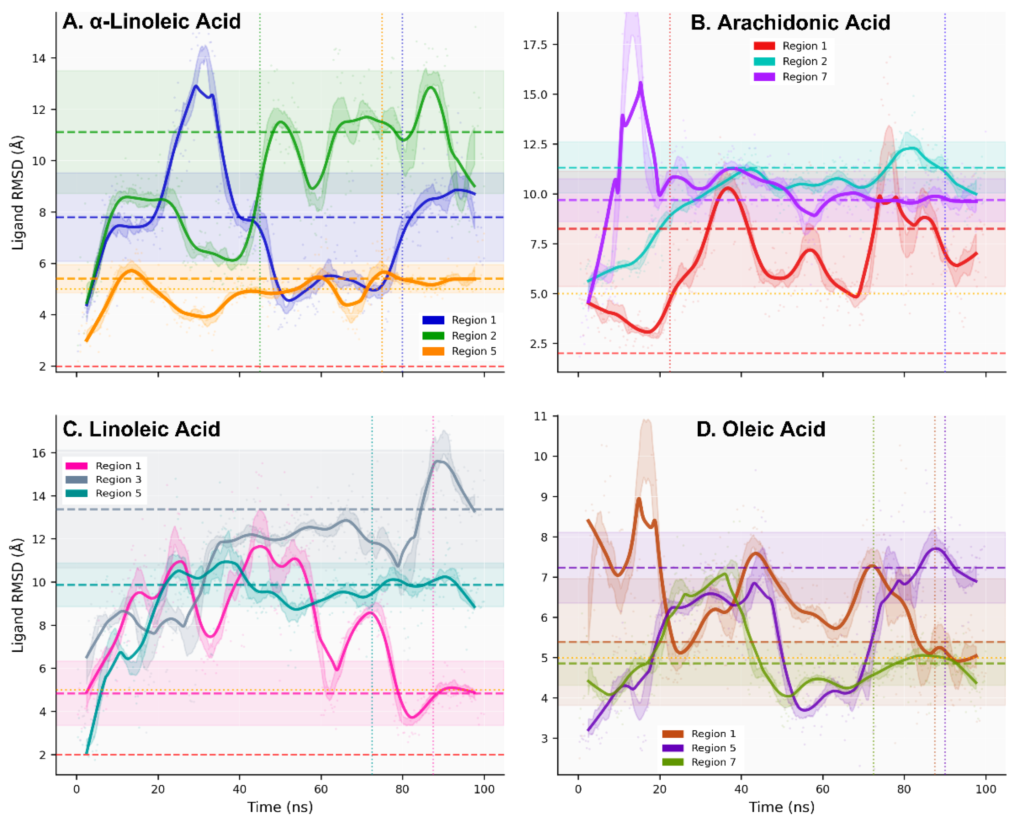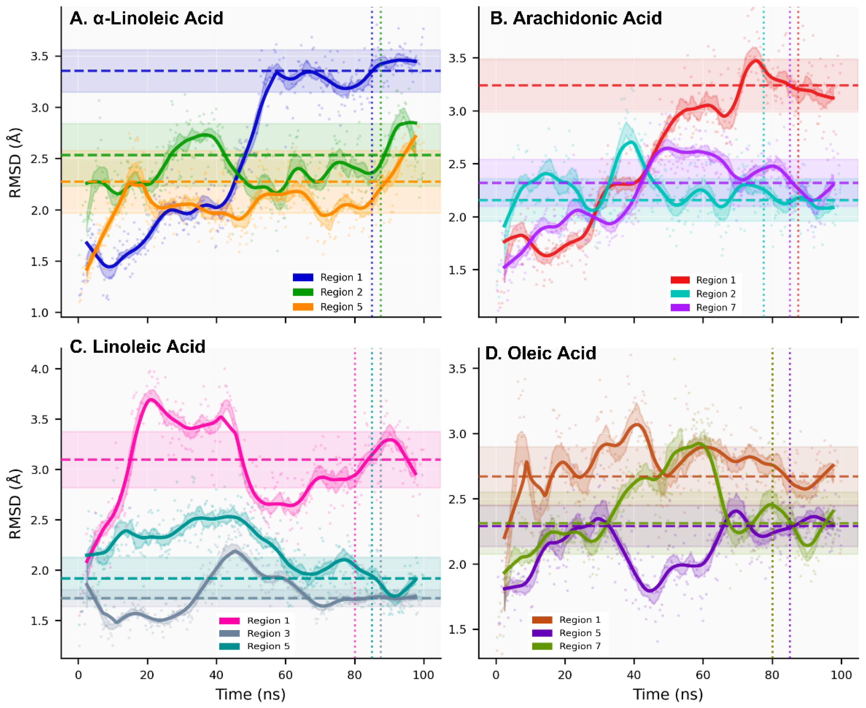 2.2. Molecular Dynamics Simulations: Conformational Stability and Dynamic Regimes