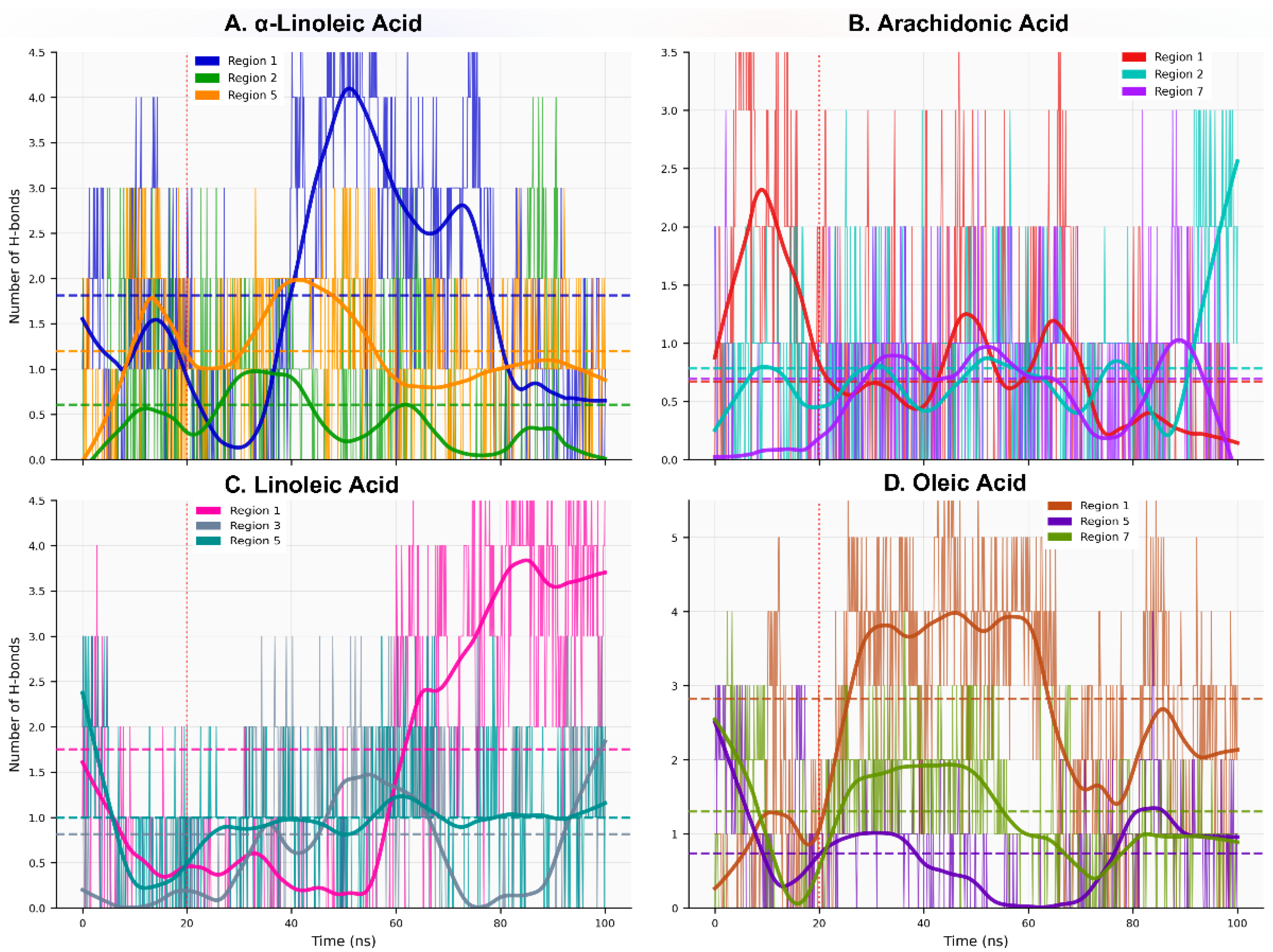 | α-Linolenic acid | 1 | −6.96 | PHE40, LEU73, PHE390, LEU391, ARG393 | — | LYS74 | LYS74 |