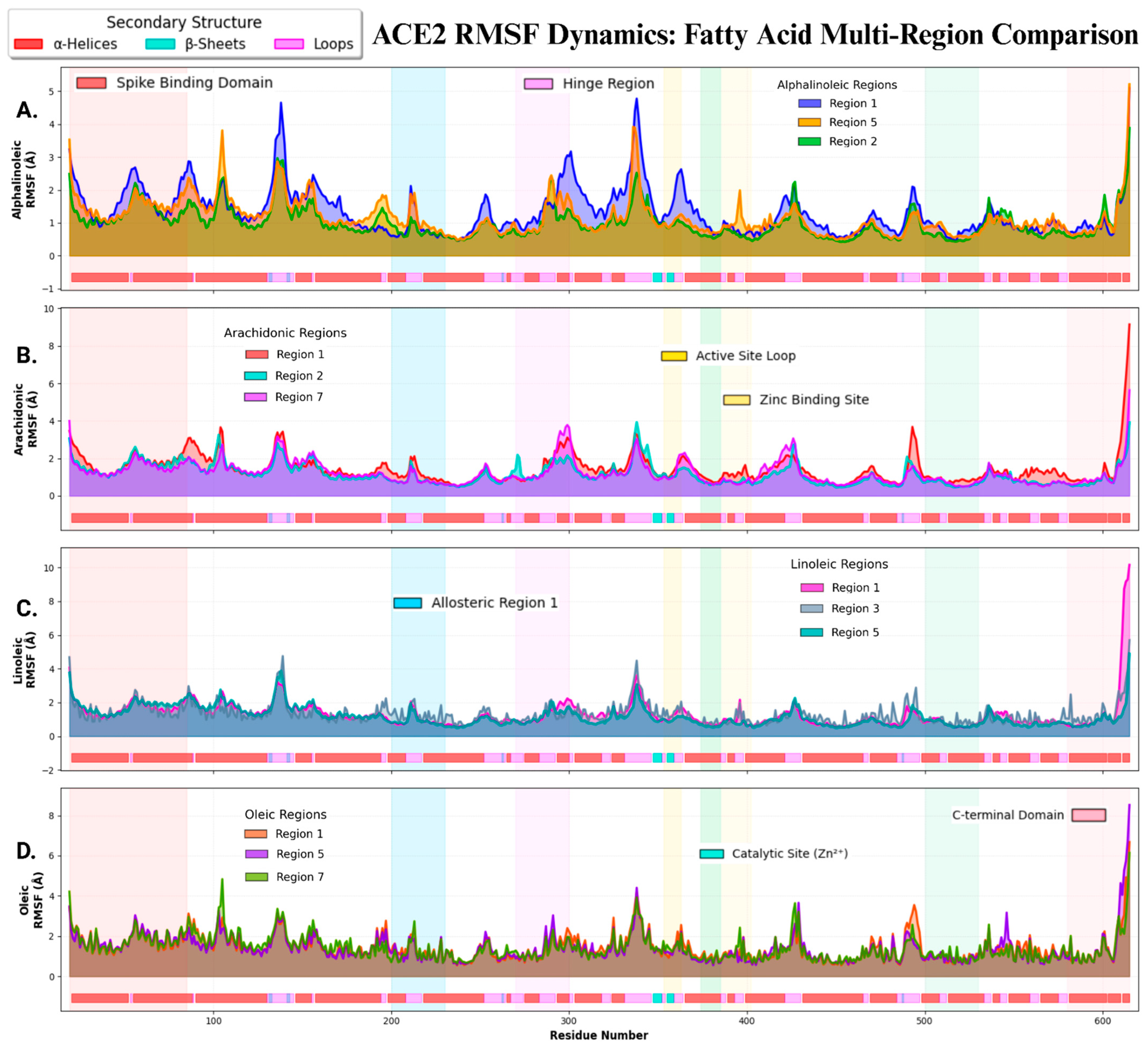 - Oliveira, A.S.F.; Kearns, F.L.; Rosenfeld, M.A.; Casalino, L.; Tulli, L.; Berger, I.; Schaffitzel, C.; Davidson, A.D.; Amaro, R.E.; Mulholland, A.J. Allosteric modulation by the fatty acid site in the glycosylated SARS-CoV-2 spike. eLife 2025, 13, 97313. [Google Scholar] [CrossRef]