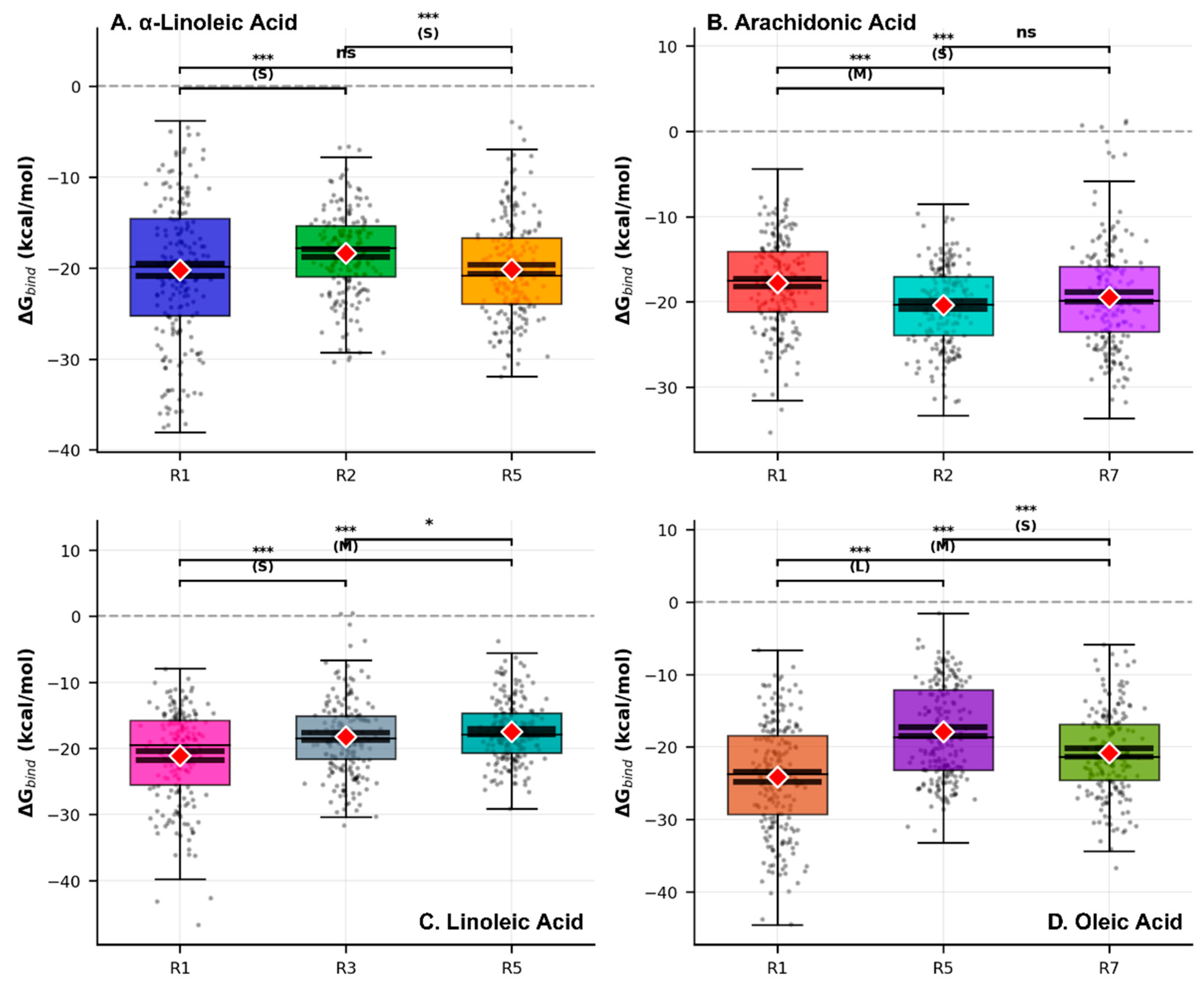 - Querido-Reis, L.; Mesquita, J.R.; Brancale, A.; Bassetto, M. Exploring the Fatty Acid Binding Pocket in the SARS-CoV-2 Spike Protein—Confirmed and Potential Ligands. J. Chem. Inf. Model. 2023, 63, 7282–7298. [Google Scholar] [CrossRef]