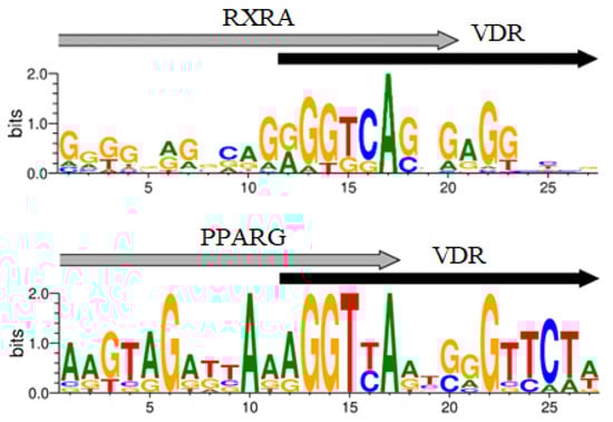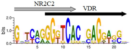The BioGRID database, which compiles information on protein–protein interactions, contains data on the interaction of VDR transcription factor (TF) with RXRA and PPARG. A protein complex formation was demonstrated for VDR-PPARG in only one study to our knowledge [42]. It was observed that NR2C2 and PPARG recognize similar DNA sequences [43], hence NR2C2 TF could also be considered a partner of VDR. The consensus sequence for PPARG conforms to the classic version: vWbbRGGbSARAGGKSR (with a p-value of 2.61 × 10−10, E-value of 5.40 × 10−07, and q-value of 1.07 × 10−06), similar to PPARA (p-value = 4.26 × 10−09, E-value = 8.83 × 10−06, q-value = 8.74 × 10−06). The CEs for VDR-PPARA and VDR-PPARG in the target genes we identified showed substantial overlap in almost all cases. Therefore, the presence of PPARA in the MCOT output may be an artifact. Additionally, the top 10 motifs in the MCOT output included TFs like ATF2, MITF, TFE3, SPI1, USF1, and REL. However, none of these were listed as VDR partners in the BioGRID database. Consequently, the most probable VDR partners are the well-known TF RXRA (p-value = 6.0 × 10−30), as well as PPARG (p-value = 2.1 × 10−22) and NR2C2 (p-value = 9.1 × 10−34). The logos of potential VDR/Partner CEs are depicted in Figure 1.