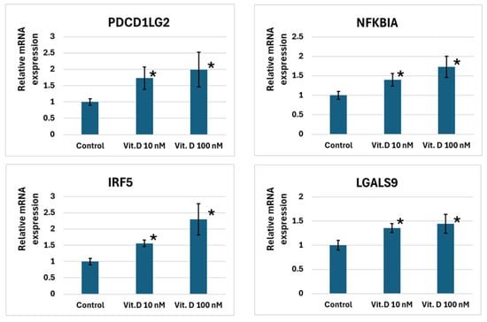 In U937 cells, 10 nM and 100 nM calcitriol increased the expression levels of PDCD1LG2, NFKBIA, IRF5, and LGALS9. MAPK13 expression increased only at a calcitriol concentration of 100 nM. NOD2 and CD14 did not respond to calcitriol (Figure 2).
