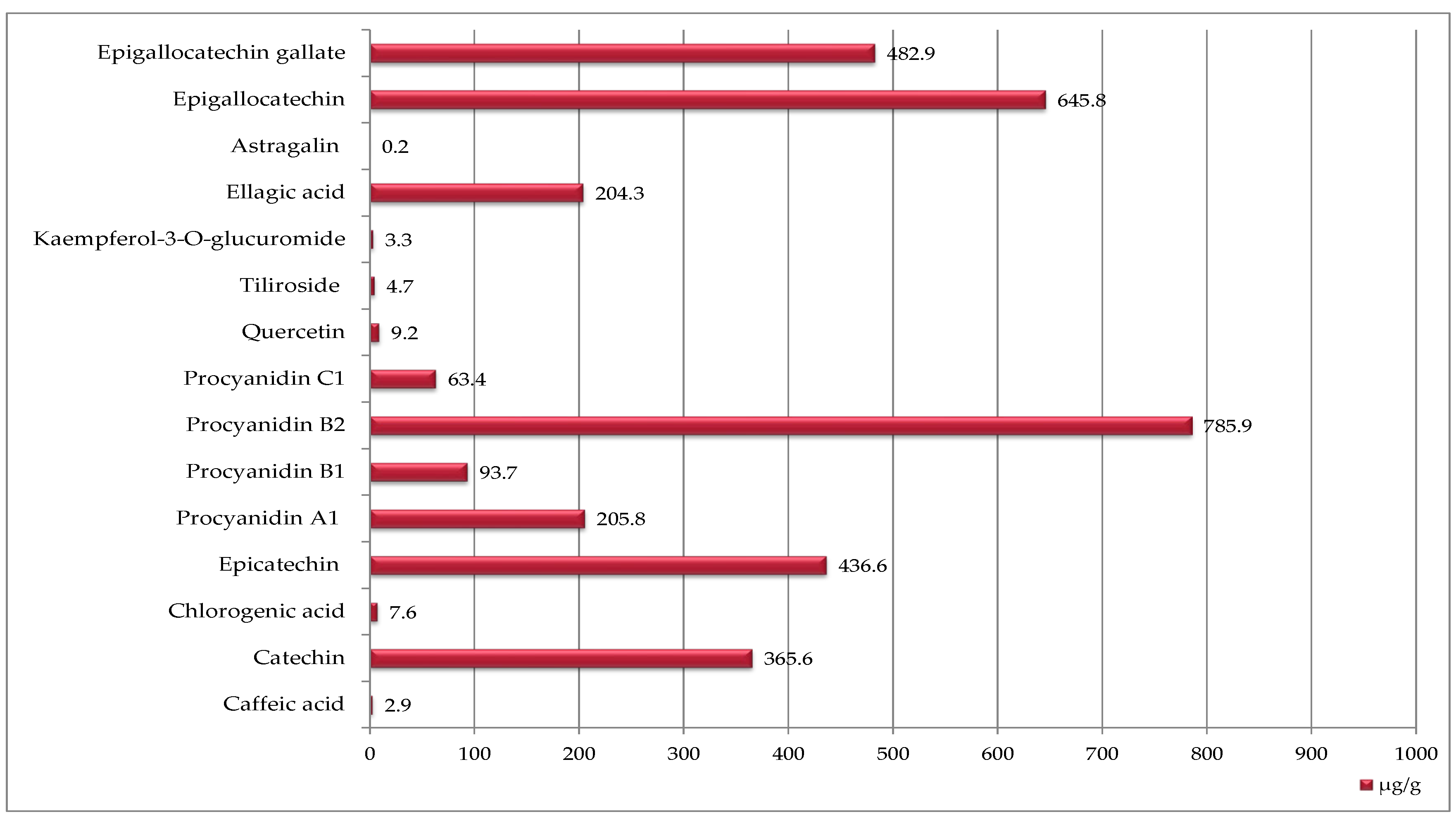 Figure 2). With procyanidin B2 being the most abundant (786 µg/g DW), followed by epigallocatechin, epigallocatechin gallate, epicatechin, catechin, procyanidin A1, and ellagic acid. However, the quantitative content of phenolic compounds in raspberry seeds was much lower than in strawberry seeds (