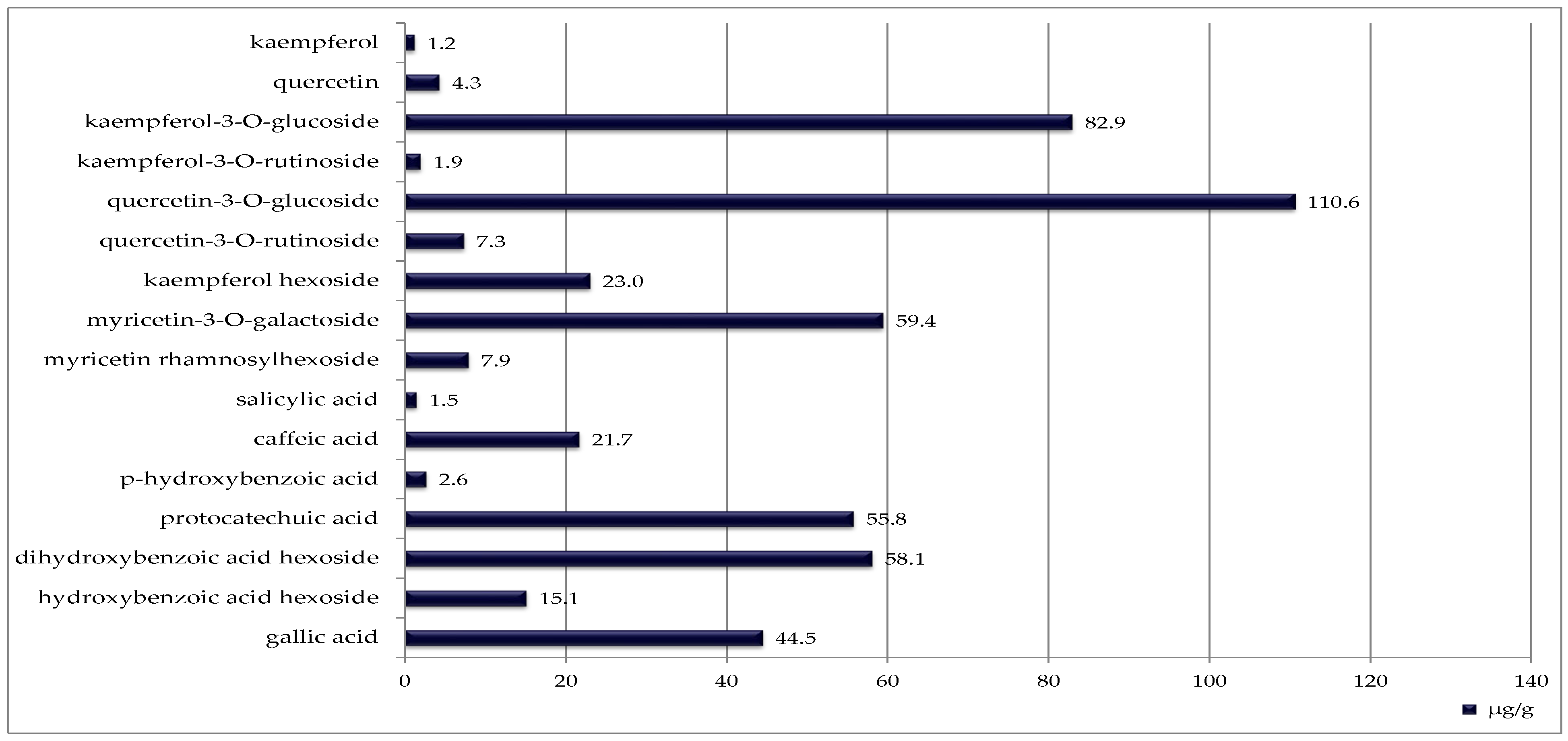 Figure 3). The most abundant was quercetin 3-O-glucoside (110.6 µg/g DW).