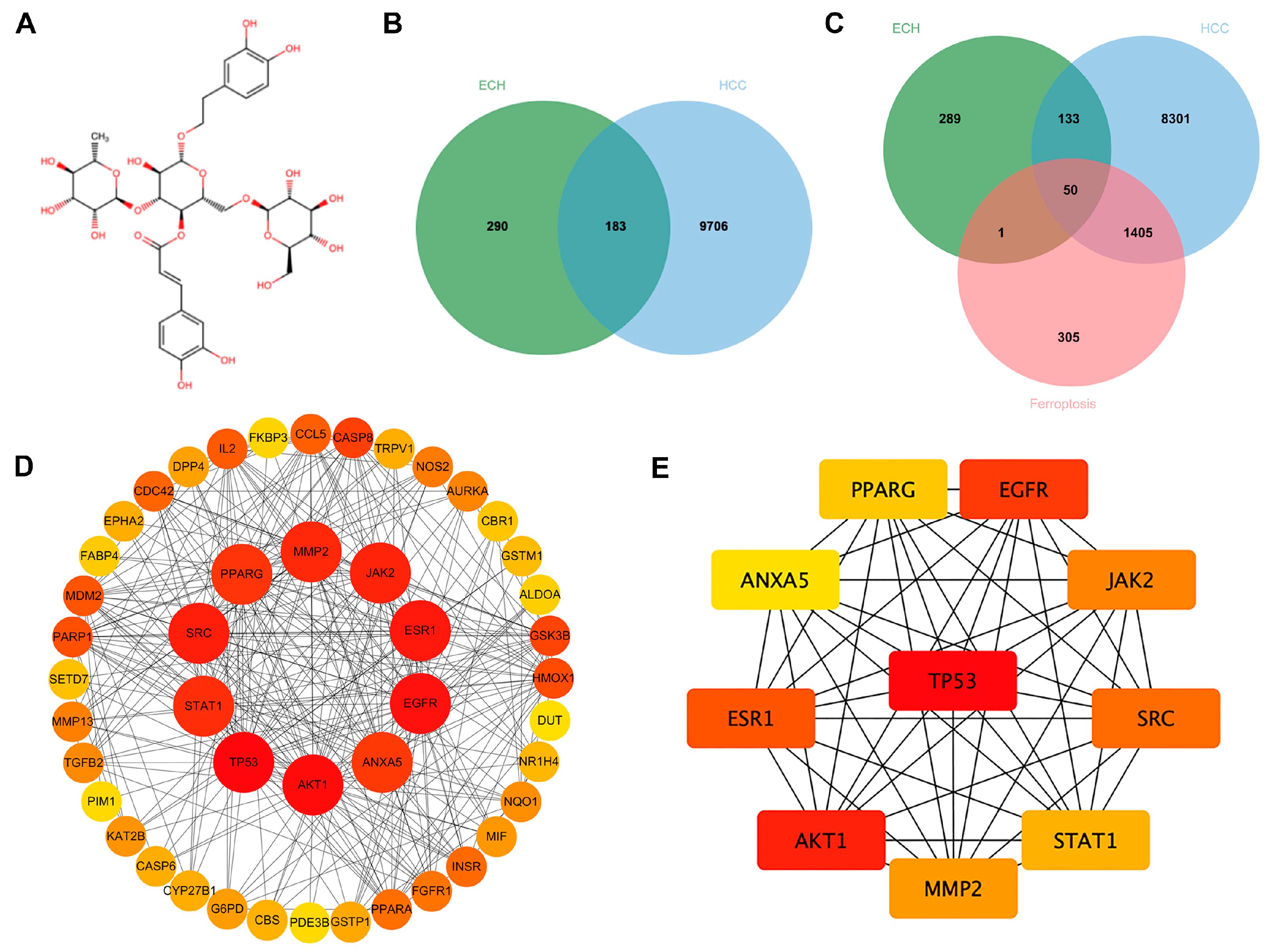 - Shu, W.; Wang, Z.; Zhao, R.; Shi, R.; Zhang, J.; Zhang, W.; Wang, H. Exploration of the Effect and Potential Mechanism of Echinacoside Against Endometrial Cancer Based on Network Pharmacology and in vitro Experimental Verification. Drug Des. Devel Ther. 2022, 16, 1847–1863. [Google Scholar] [CrossRef]