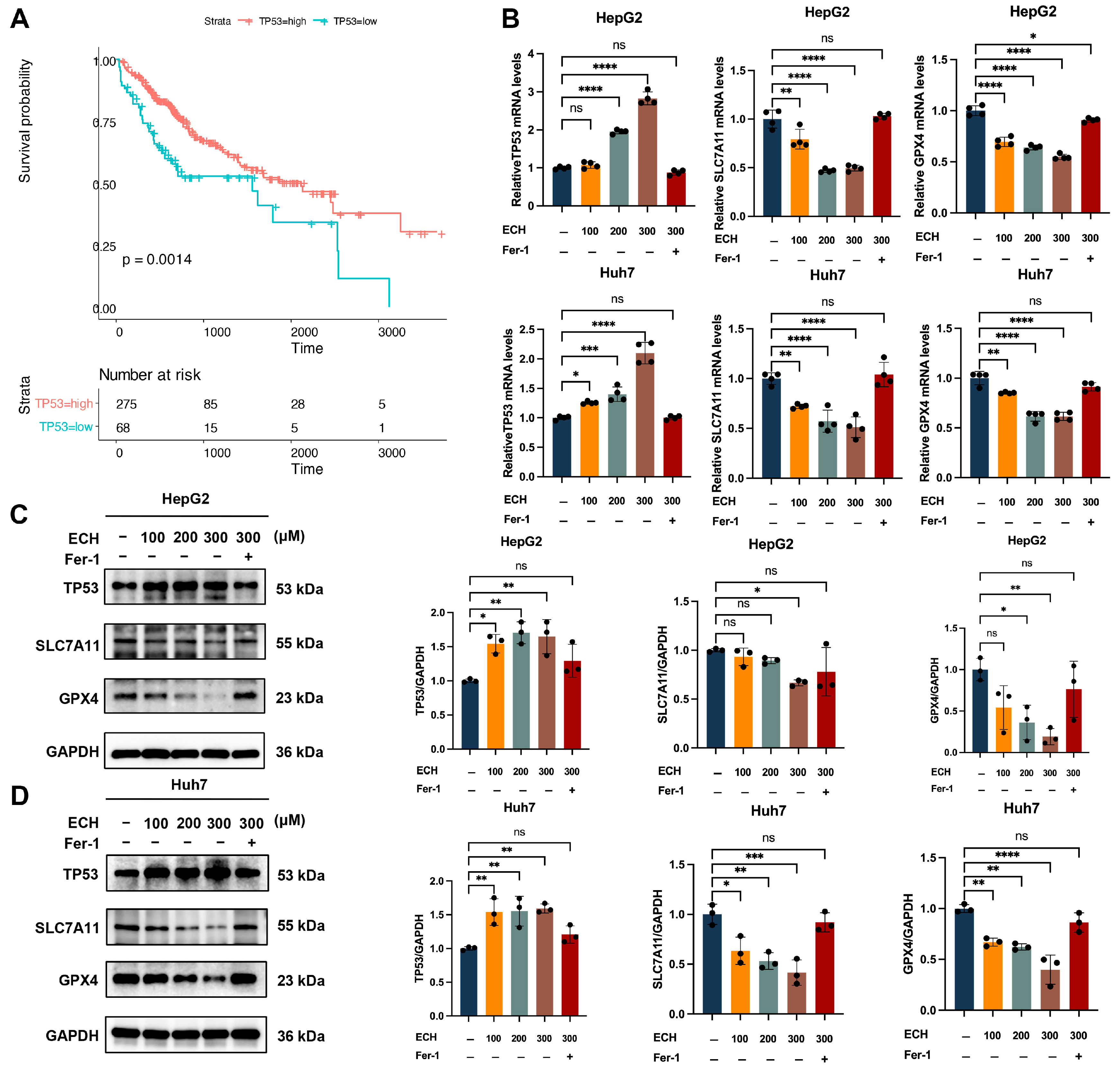 2.7. ECH Induces Ferroptosis in HCC Cells via the TP53/SLC7A11/GPX4 Signaling Pathway