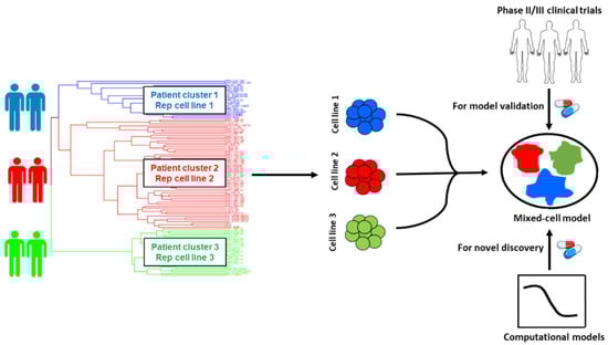 Currently, more than 80% of novel anti-cancer compounds which show promising preclinical results do not clear Phase II clinical trials [5,6]. Typically, preclinical testing has been carried out in models such as individual cancer cell-lines or patient-derived cells, in vitro and in vivo. The selection of these models is primarily empirical and based on availability. This practice fails to reflect the variability in drug responses across diverse patient cohorts and therefore produces inaccurate results. Furthermore, the systematic evaluation of FDA-approved combinatorial therapies that have been tremendously beneficial in improving treatment outcomes and mitigating therapy resistance, has revealed that their clinical efficacy is linked to heterogeneity [7,8]. By the principle of independent drug action (IDA), each component drug in the combination (combo) independently targets a distinct variant/subtype of the heterogeneous disease. The current method for preclinical drug testing interrogates one homogeneous model at a time and then aggregates the results from these models to estimate overall combo efficacy. This practice cannot accurately assess drug combos whose efficacy is attributable to IDA. To overcome these issues, we were motivated to develop new preclinical models that capture inter-individual tumor heterogeneity within diverse patient cohorts. Our rationale is that by advancing only drug/drug combos that are preclinically validated in these models, we will increase the efficiency and success rate of their subsequent clinical validation. Improving preclinical models has always been a high priority in the field of cancer biology. For example, advances in tissue engineering, such as new biomaterials and microfluidics, have facilitated improved culture quality and reproducibility in ex-vivo models [9,10]. More recently, co-culturing tumor cells with cancer-associated fibroblasts, immune and endothelial cells in organoid models, achieved the complex cellular architecture of patient tumors [11]. Advances have also been made in improving PDX models which allow the interrogation of drug response in the presence of an intact tumor microenvironment (TME), under physiological conditions [12,13,14,15,16]. Yet, the majority of these models focus on recapitulating tumor cell-extrinsic features, mainly its interaction with the TME. A model that replicates the intrinsic genetic and phenotypic heterogeneity in cancer cells derived from distinct patients is absent. To bridge this gap, the work presented here focuses on creating novel in vitro models that capture the complex and diverse transcriptomic landscape of cancer cells in a large clinical cohort, for utility in preclinical drug combo testing. We hypothesized that a mixture (co-culture) of cancer cell-lines representing genetically distinct tumor variants harbored in a diverse patient cohort can broadly encompass the scope of inter-patient heterogeneity in a specific cancer type. It is worth noting that pooling cancer cell-lines and using them for drug screens has been carried out by the Broad Institute PRISM platform, where up to 578 cancer cell-lines were DNA-barcoded and combined for collective screening across a panel of 4518 drugs [17,18]. However, since the end goal of the PRISM project was to enable high throughput screening of large drug libraries, their rationale for cell-line pooling was based on the similarity in cell growth rates and/or tissue origin. Conversely, in this study, rationally selected cancer cell-lines were combined with the goal of replicating disease-specific genetic heterogeneity in patient tumor cells from a diverse cohort.