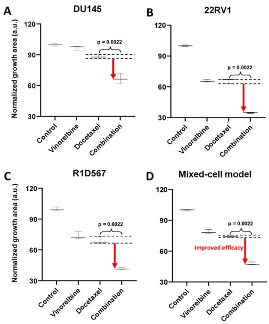 To demonstrate the functional utility and accuracy of this model, we tested two clinically validated drug combos, one of which achieved superior clinical efficacy over either monotherapy (positive proof of concept) and another which failed to do so in PC patient cohorts (negative proof of concept). Currently, docetaxel is a standard of care (SoC) therapy in the treatment of CRPC. Previous preclinical studies have shown that the addition of a tyrosine kinase inhibitor, dasatinib, to docetaxel further reduced tumor growth, migration, and bone metastasis in mouse models compared to docetaxel alone [27,28]. Note that the mouse xenograft models employed in these studies incorporated a single PC line, C4-2B. Moreover, dasatinib and docetaxel combo therapy was found to be well-tolerated in a phase I trial [29]. However, in a phase III, double-blind, randomized controlled trial of 1522 men who received docetaxel plus prednisone along with either dasatinib or placebo, no difference was observed between the median overall survival times of the two arms (HR 0.99, 95.5% CI 0.87–1.13) [30]. Therefore, docetaxel + dasatinib was selected to be tested in our new mixed-cell model to establish negative proof of concept. Growth analysis of the constituent PC lines in the co-cultures (Figure 3A–C) revealed that inhibition of DU145 (Figure 3A) and 22RV1 (Figure 3B) CRPC subtypes was driven by docetaxel, with no additional benefit being conferred by dasatinib. In R1D567 (Figure 3C), a slight yet significant improvement in efficacy was achieved by the combo (p = 0.027), as indicated by the difference between the measured combo efficacy and the dashed lines denoting the effect of the most efficacious monotherapy. However, this marginal improvement was imperceptible in the composite tumor mixture where the combo failed to enhance anti-tumor efficacy over the most potent monotherapy, docetaxel (Figure 3D). Therefore, the in vitro efficacy of the drug combo measured in the mixed-cell model was consistent with the Phase III clinical trial results. An identical experimental approach and procedure were adopted to evaluate the drug combo of docetaxel and vinorelbine as positive proof of concept (Figure 4). This combo has demonstrated preclinical potency in both androgen-dependent and androgen-independent PC cell-lines. Clinically, the combo improved the objective response rate relative to current CRPC therapy regimens [31,32]. When assessed in our model, the combo achieved greater inhibition of the component cell-lines (Figure 4A–C) as well as of the tumor mixture (Figure 4D) compared to either single-agent drug. Once again, the mixed-cell model could successfully reproduce the therapeutic outcomes observed clinically in patient studies.